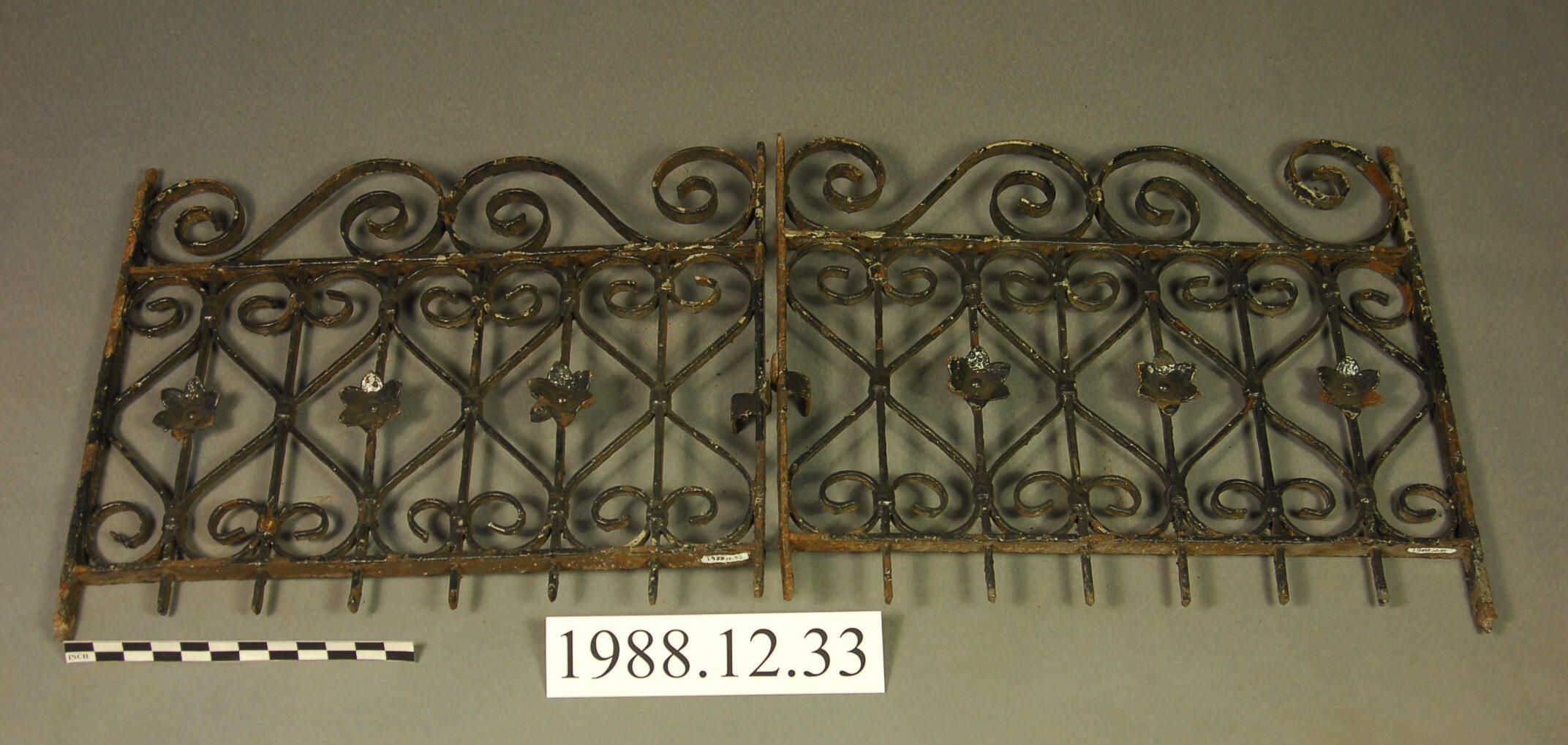 One lot of two (matched pair) of Gates. Rectangular frames of wrought iron, with vertical bars and scrolled infill. Collars on joints. Sheet iron Floral Motifs. Scrolls on top of frame. Pivots on one side of edge of each respective gate. Painted black. Original gilding evident.