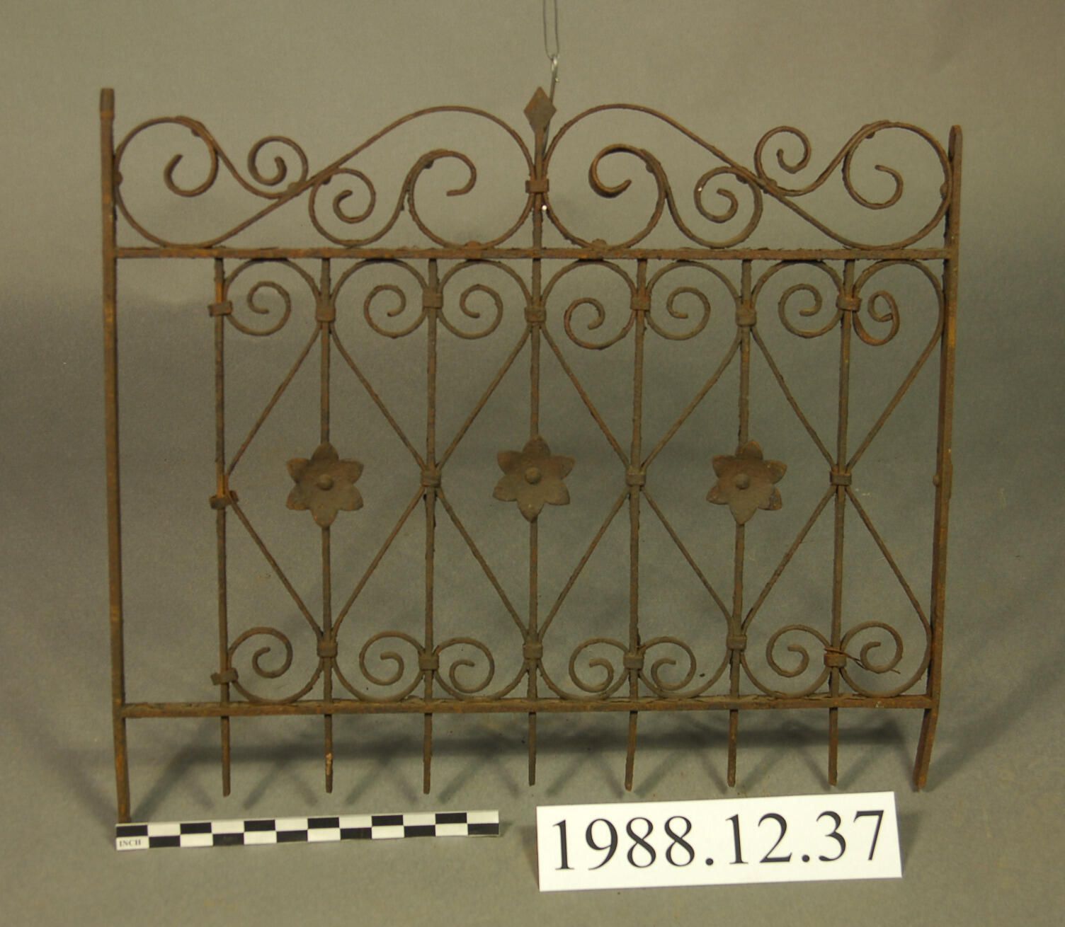 Gate. Rectangular frame of wrought iron, with vertical bars, and scrolled infill. Collars on joints. Floral Motifs. Riveted tenon joints. Scrolls and single Finial on top of frame. Pivots on one side. Painted black.
