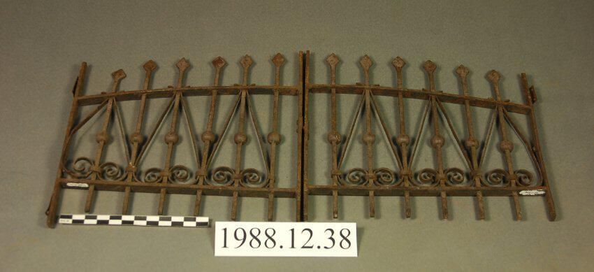 Matched pair of Gates. Rectangular frame of wrought iron. Vertical bars with Ball Ornaments. Scrolled infill. Riveted tenon joints. Top of each frame is curved and has series of lance-shaped Finials. Hinged on one edge of each respective gate. One hinge is missing. Painted dark brown.