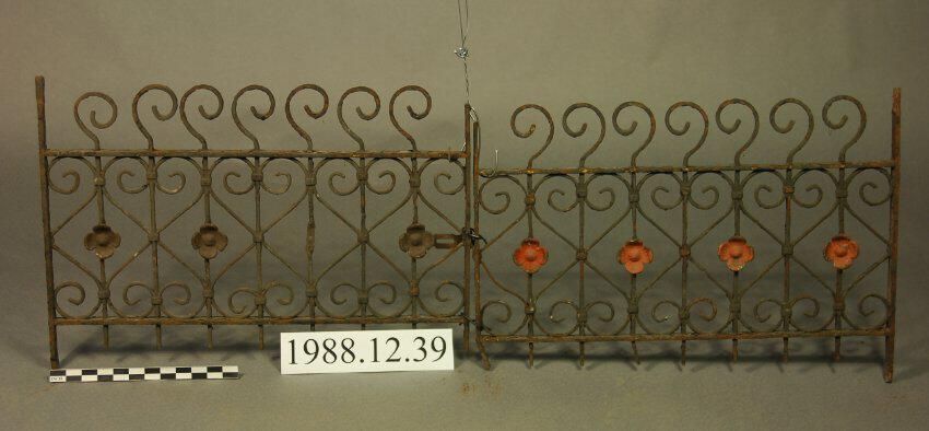 Matched pair of Gates. Rectangular frame of wrought iron. Vertical bars with attached Floral Ornaments (one Ornament is missing). Scrolled infill collars on joints. Riveted tenon joints. Top of frame has scrolled Finials. Pivots on one edge of each respective gate painted black / red. One gate has Hasp.