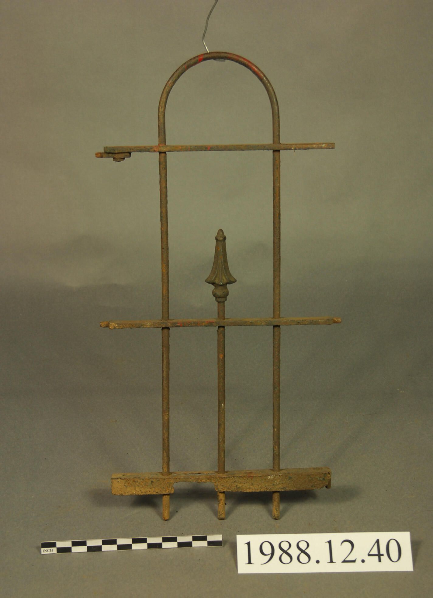 Fence segment with two horizontal bars and one angle iron. Round rod bent into "U" attached to bars. Centered round rod with Botanical Motif Finial. Remnants of paint.