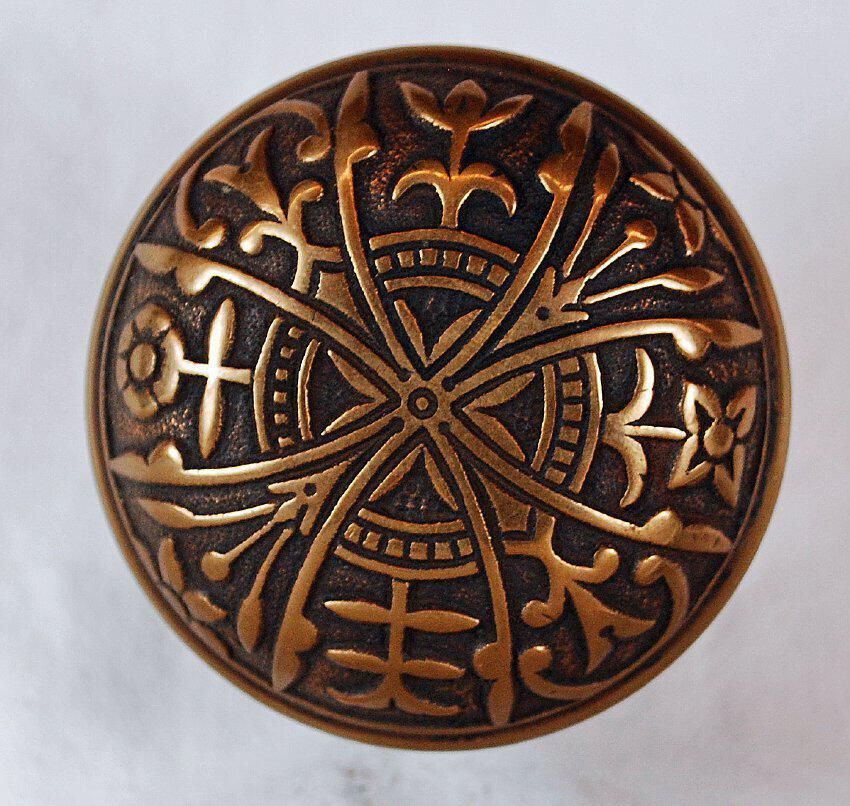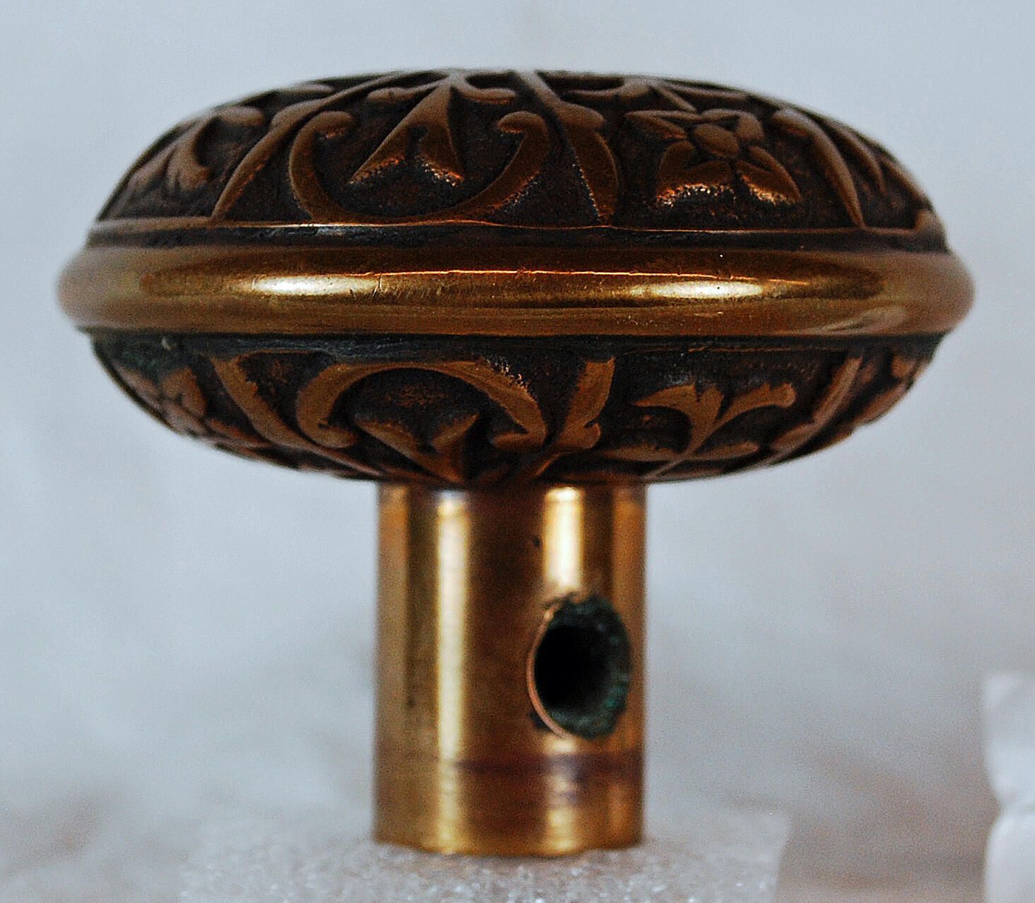 Design Name: Manufacture: Lockwood Mfg. Co. Style: Aesthetic Material: Bronze Manufacturing Method: Cast Surface Finish: Unpolished VDA Classification: Fourfold Symmetry VDA Number: H - 206 Shape: Domed Patent Specifics: Lock Type (If Applicable): Inscription/Makers Mark: Inscription Text: Comments: Original Patina.
