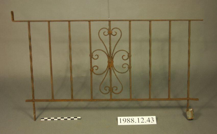 Iron Railing section. Two horizontal rails with series of vertical bars. Alternating twisted and straight. Central scrolled Ornament attached with collars. Bars attached to rails with bolts. One end of top rail is forged and has hole for mounting. Opposite end is truncated. Remnants of black paint. See 1988.12.43.1.