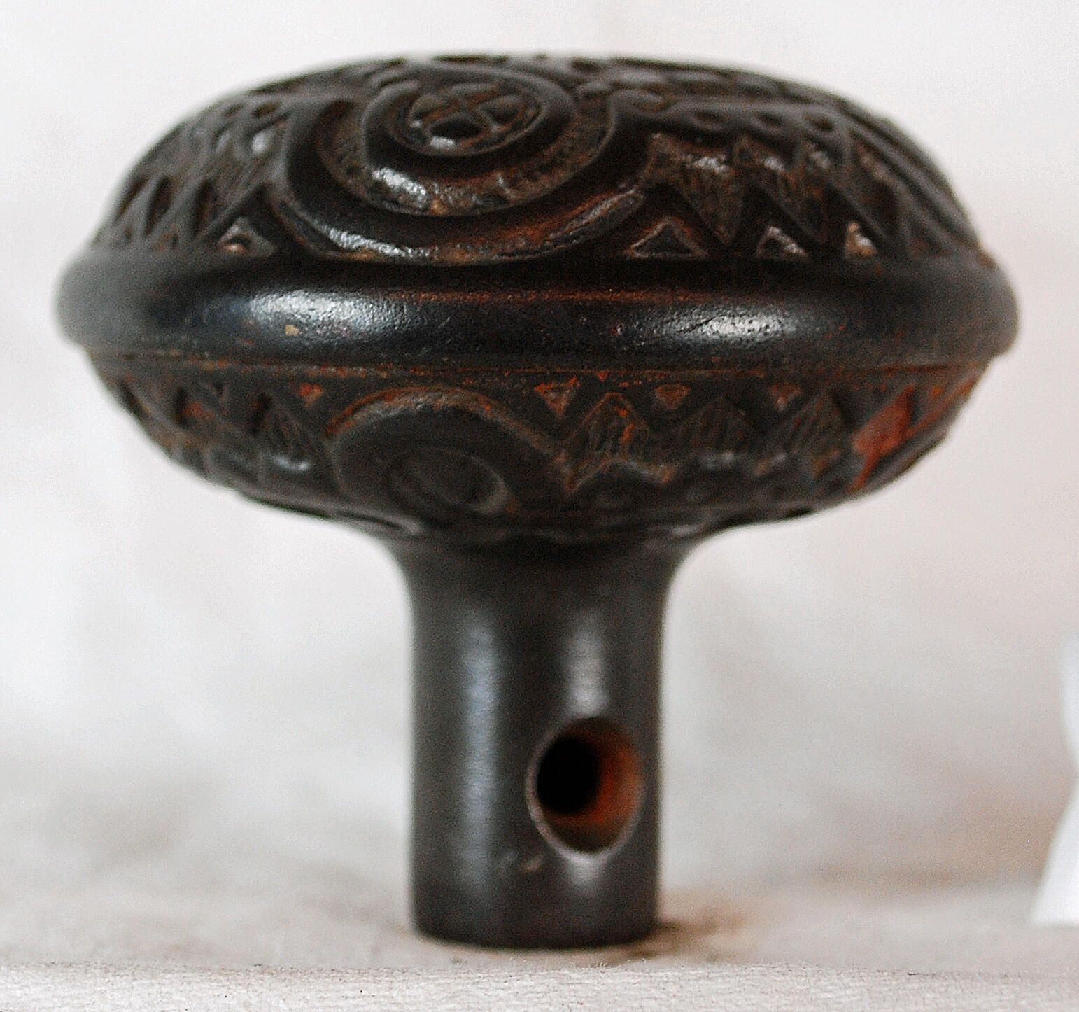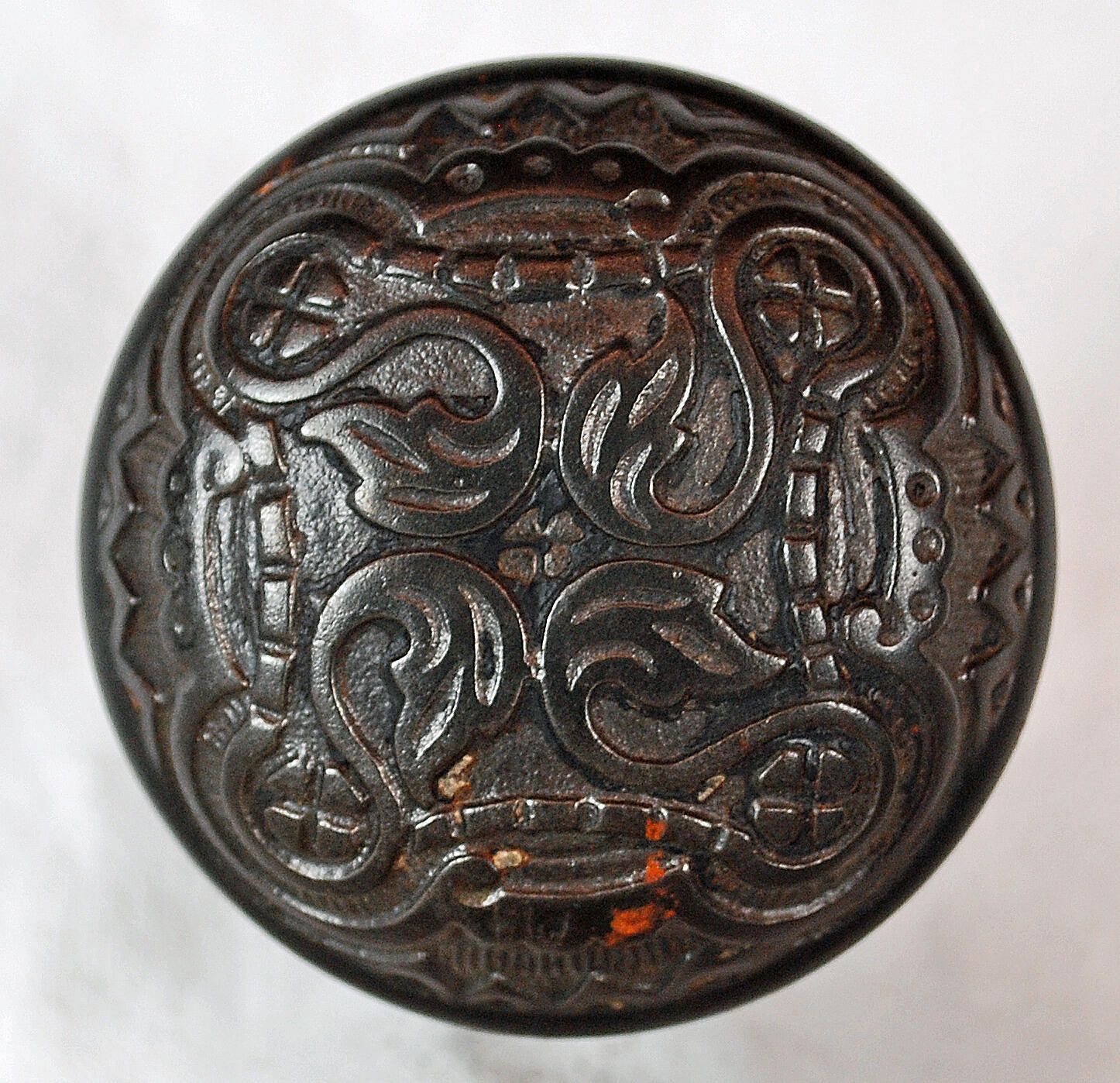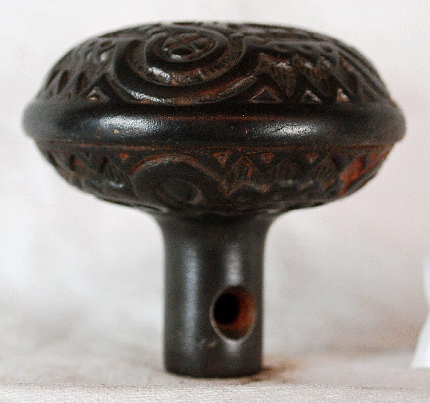 Design Name: Egyptian? Manufacture: Kean & Doty? Style: Kaystone Material: Iron Manufacturing Method: Cast Surface Finish: Unpolished VDA Classification: Fourfold Symmetry VDA Number: H - 211 Shape: Domed Patent Specifics: Lock Type (If Applicable): Inscription/Makers Mark: Inscription Text: Comments: