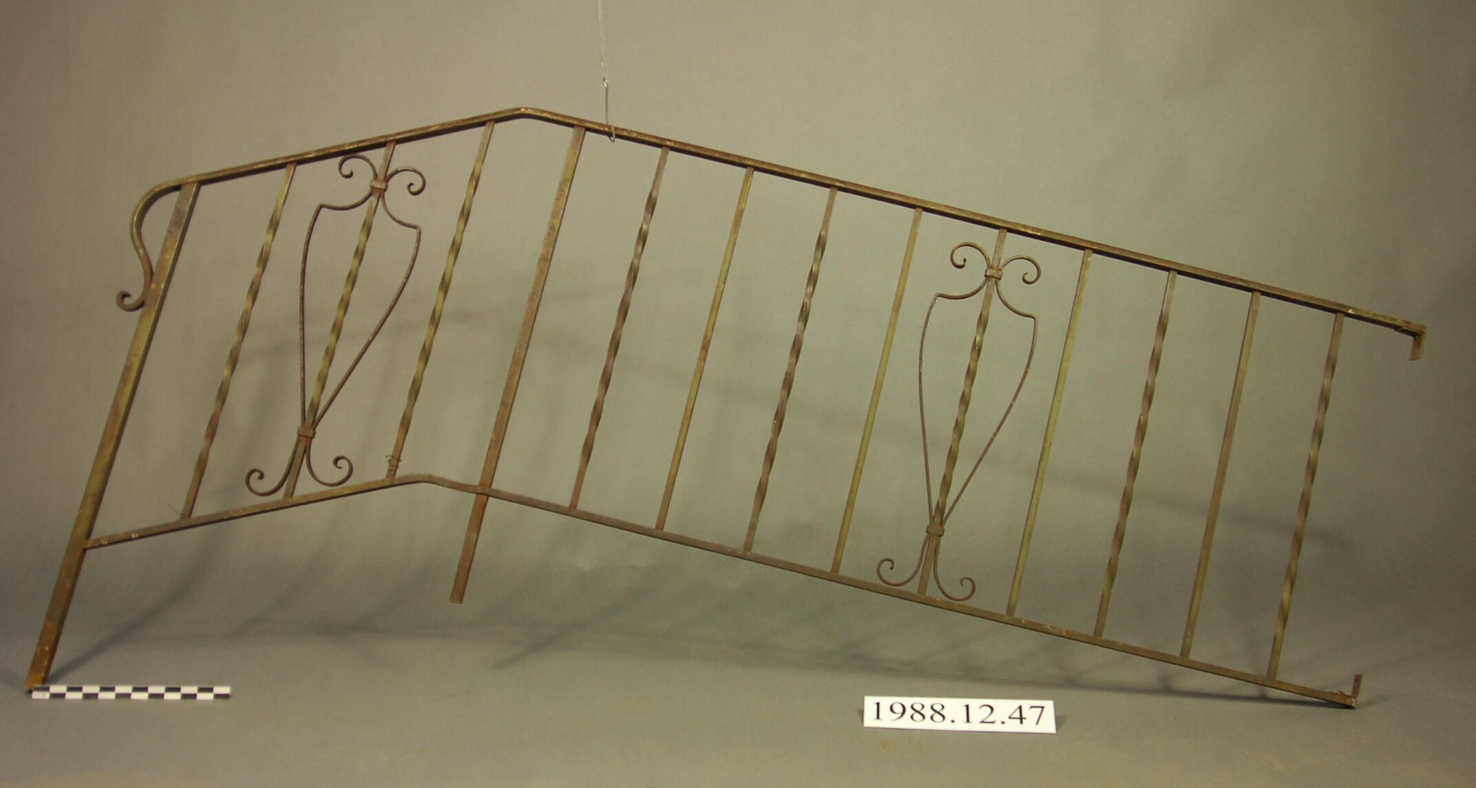 Railing section. Steel to fit contour of stair and landing. (Has angled appendage). Series of square straight vertical bars alternating with twisted bars. Has scrolled Ornament. Top rail with looped end. Railing has two square posts. Lower rail attached to bars. Modern welded, bolted and riveted tenon fabrication.