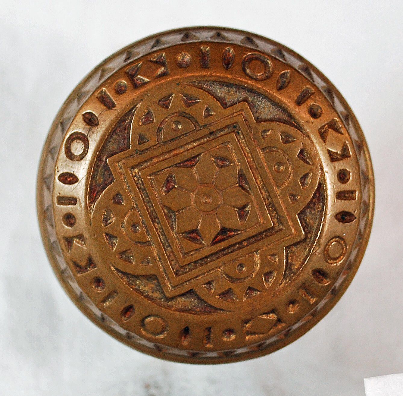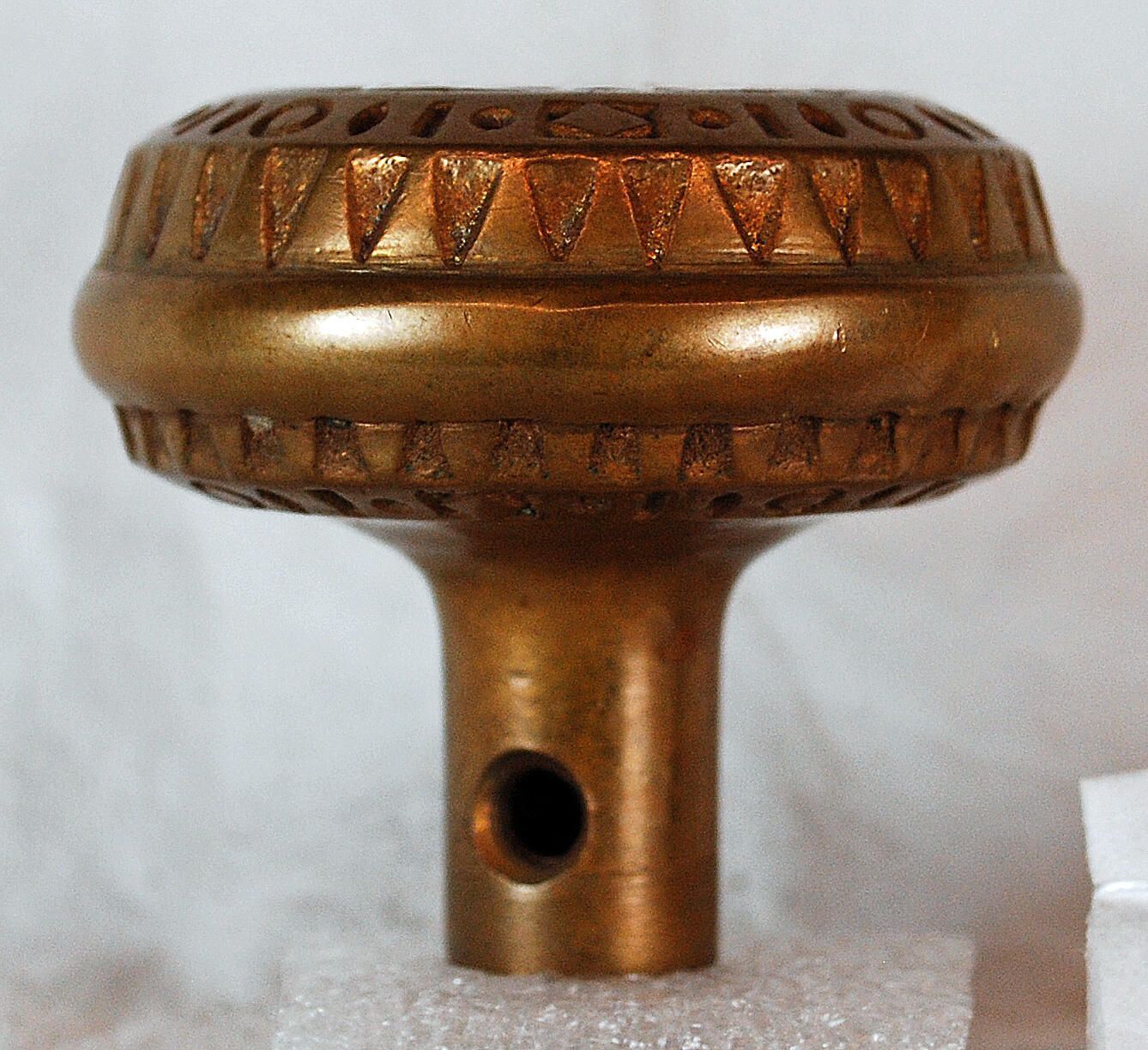 Design Name: Manufacture: Style: Eastlake Material: Bronze Manufacturing Method: Cast Surface Finish: Unpolished VDA Classification: VDA Number: Similar to - 222 Shape: Domed / Drum Patent Specifics: Lock Type (If Applicable): Inscription/Makers Mark: Inscription Text: Comments: Stripped Missing OriginalPatina, Two Piece.