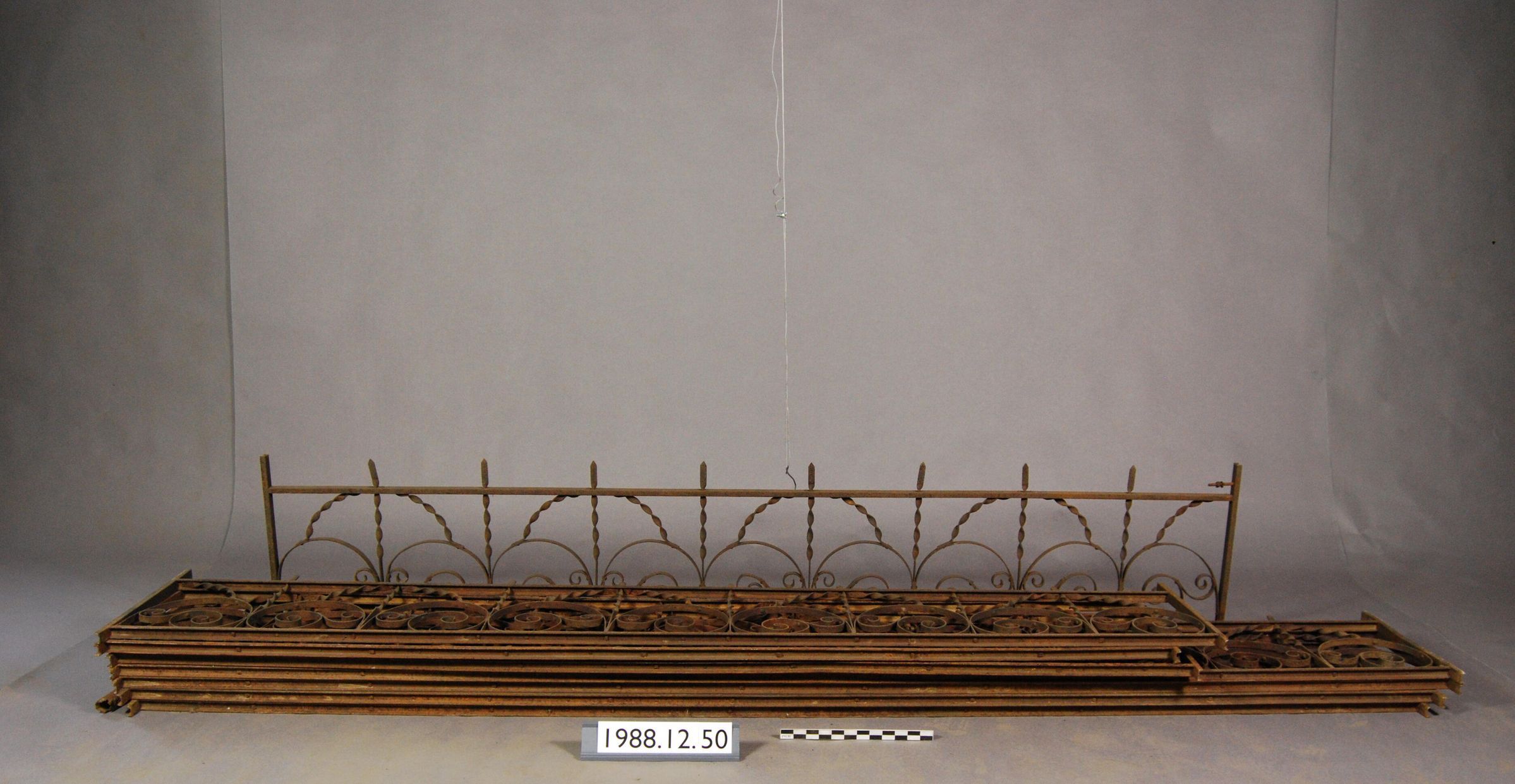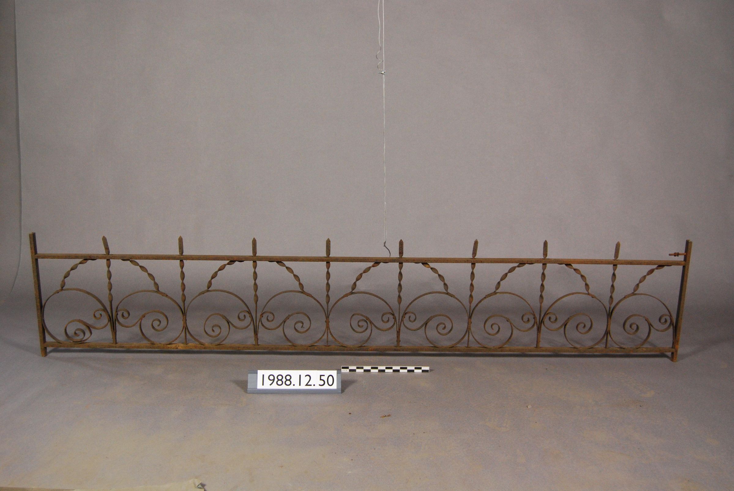 One lot of 8 rectangular frame fence sections of channel iron with series of upright twisted straps with Finials. Infills of repeated whiplash scrolls. Riveted construction.