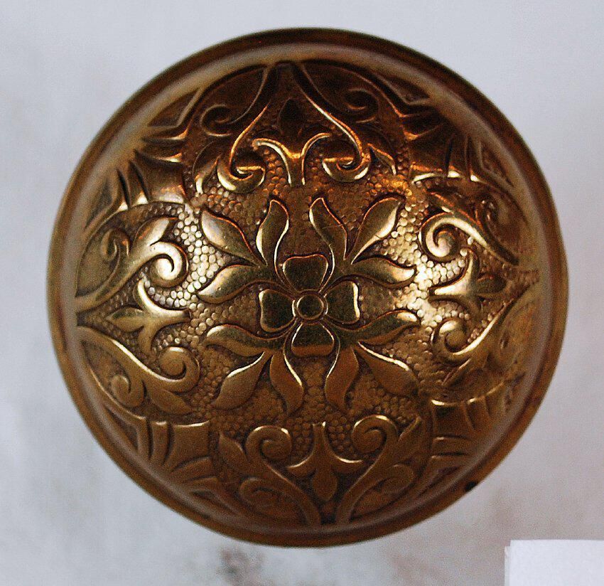 Design Name: Castro Manufacture: Lockwood Mfg. Co. Style: Aesthetic Material: Brass Manufacturing Method: Wrought Surface Finish: Aged / Unpolished VDA Classification: H VDA Number: H - 262 Shape: Domed Patent Specifics: Lock Type (If Applicable): Inscription/Makers Mark: Inscription Text: Comments: Worn.