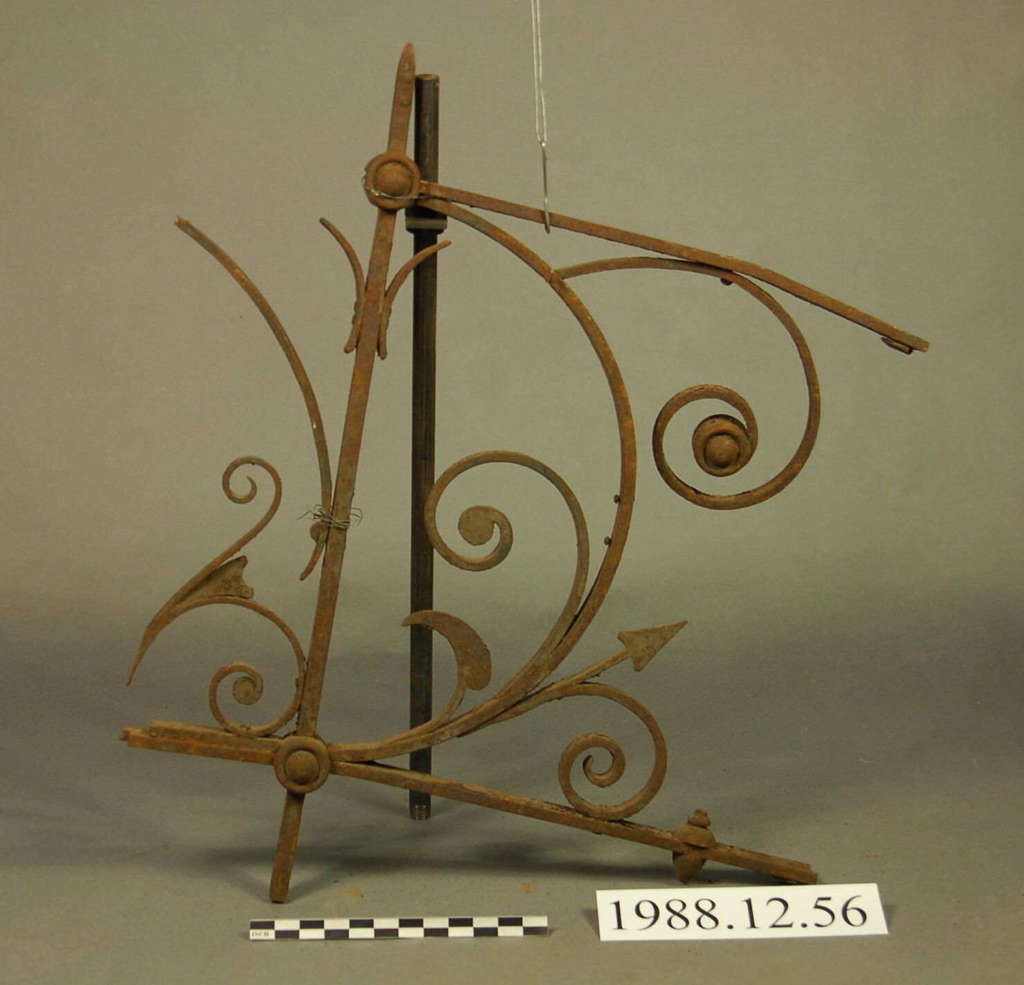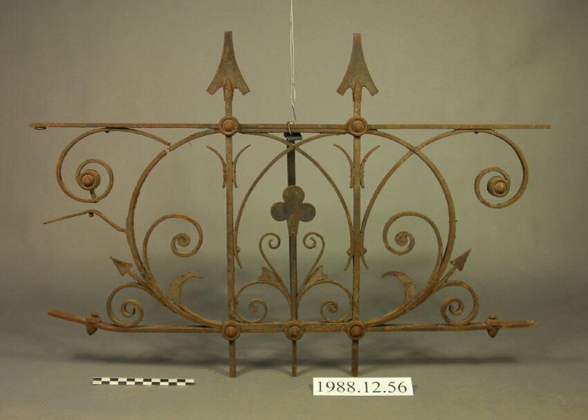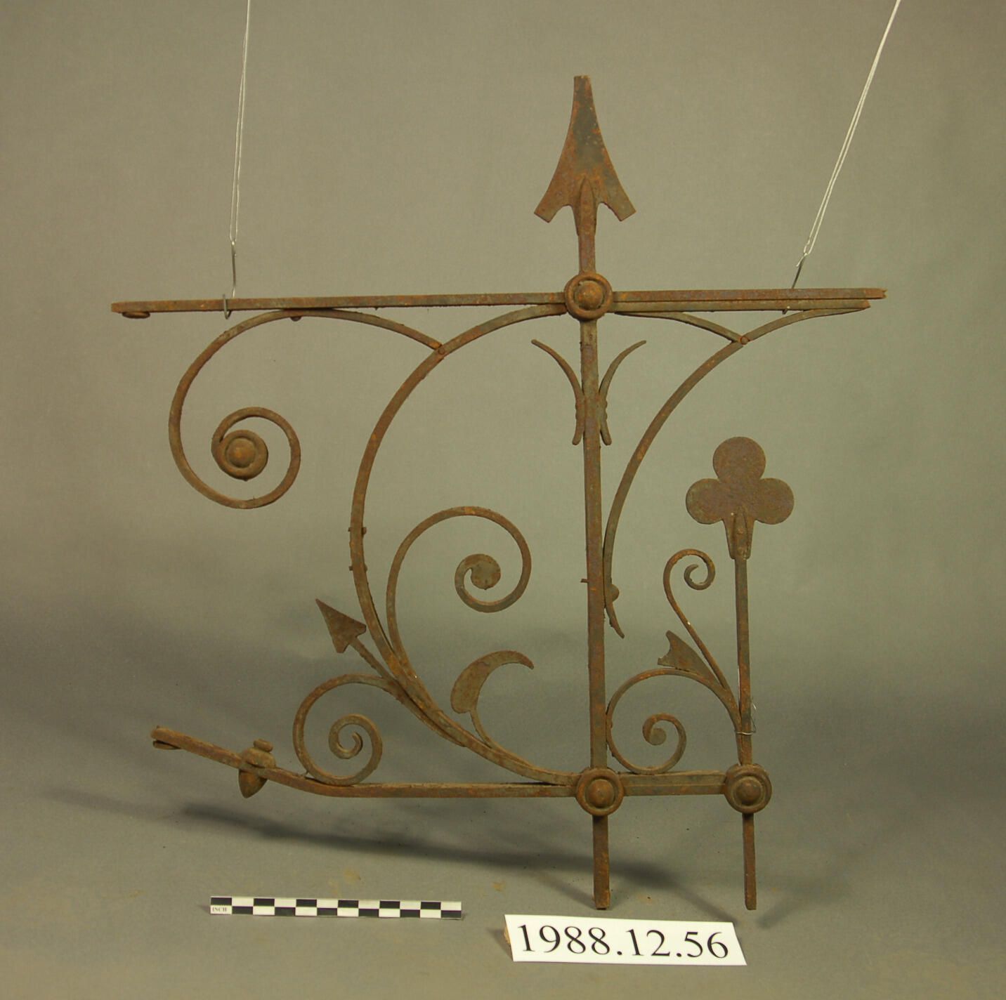 One lot of two Cresting sections from roof of 1880 Labbe Block. Elaborate forged wrought iron with Scroll / Leaf / Cloverleaf Motif. Top and bottom horizontal bars. Bolted and riveted joints. One section broken into multiple parts. Originally with two Finials. One is missing. Minor missing Ornament. Second section has both Arrow shaped Finials, but other minor missing Ornament. See 1988.12.56.1.
