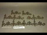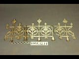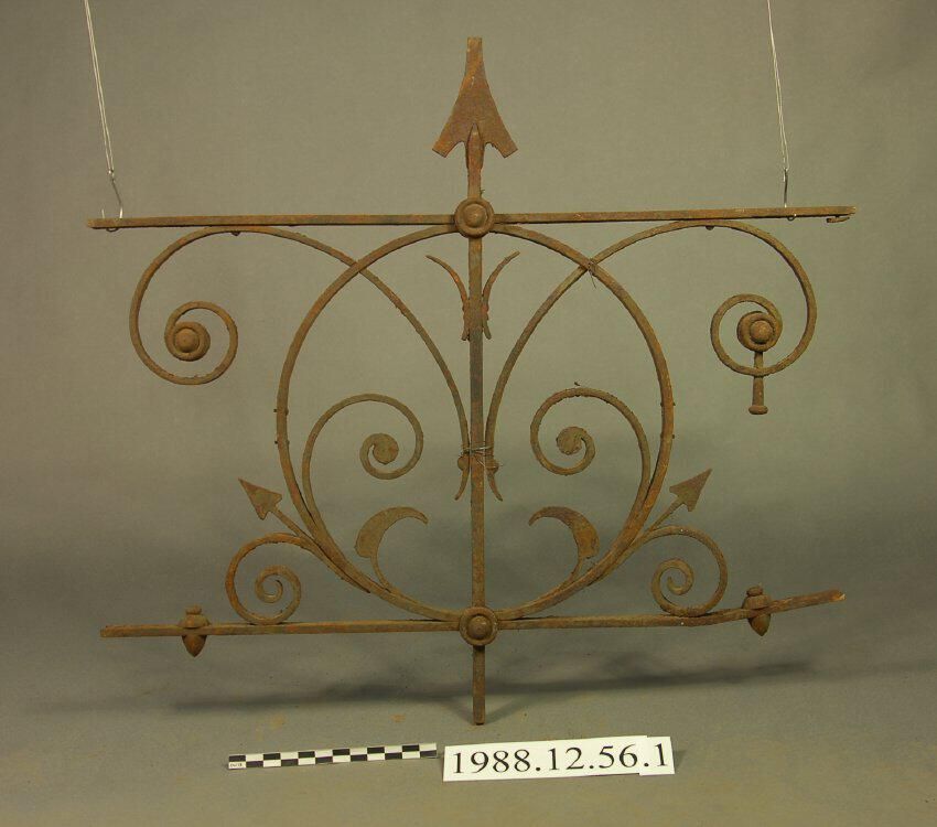 One lot of four Cresting sections from roof of 1880 Labbe Block. Elaborate forged wrought iron with Scroll / Leaf Motif. Top and bottom horizontal bars. Bolted and riveted joints. One section is broken. Missing Finial and other minor Ornament. See 1988.12.56.