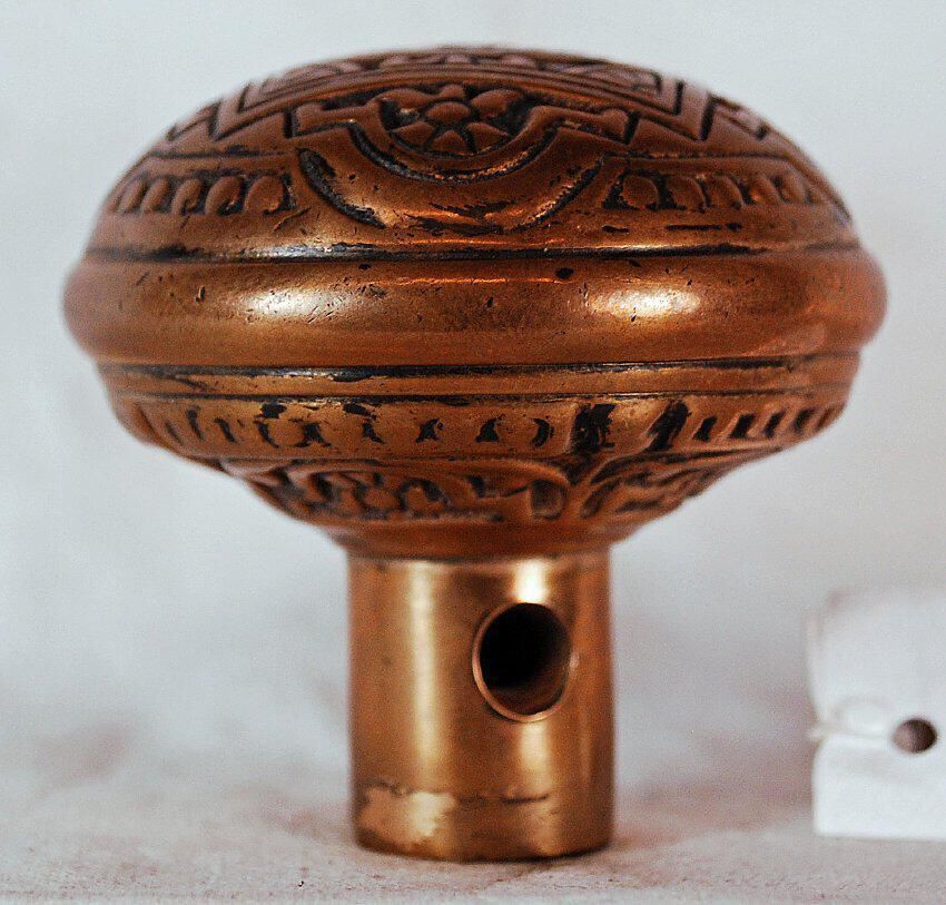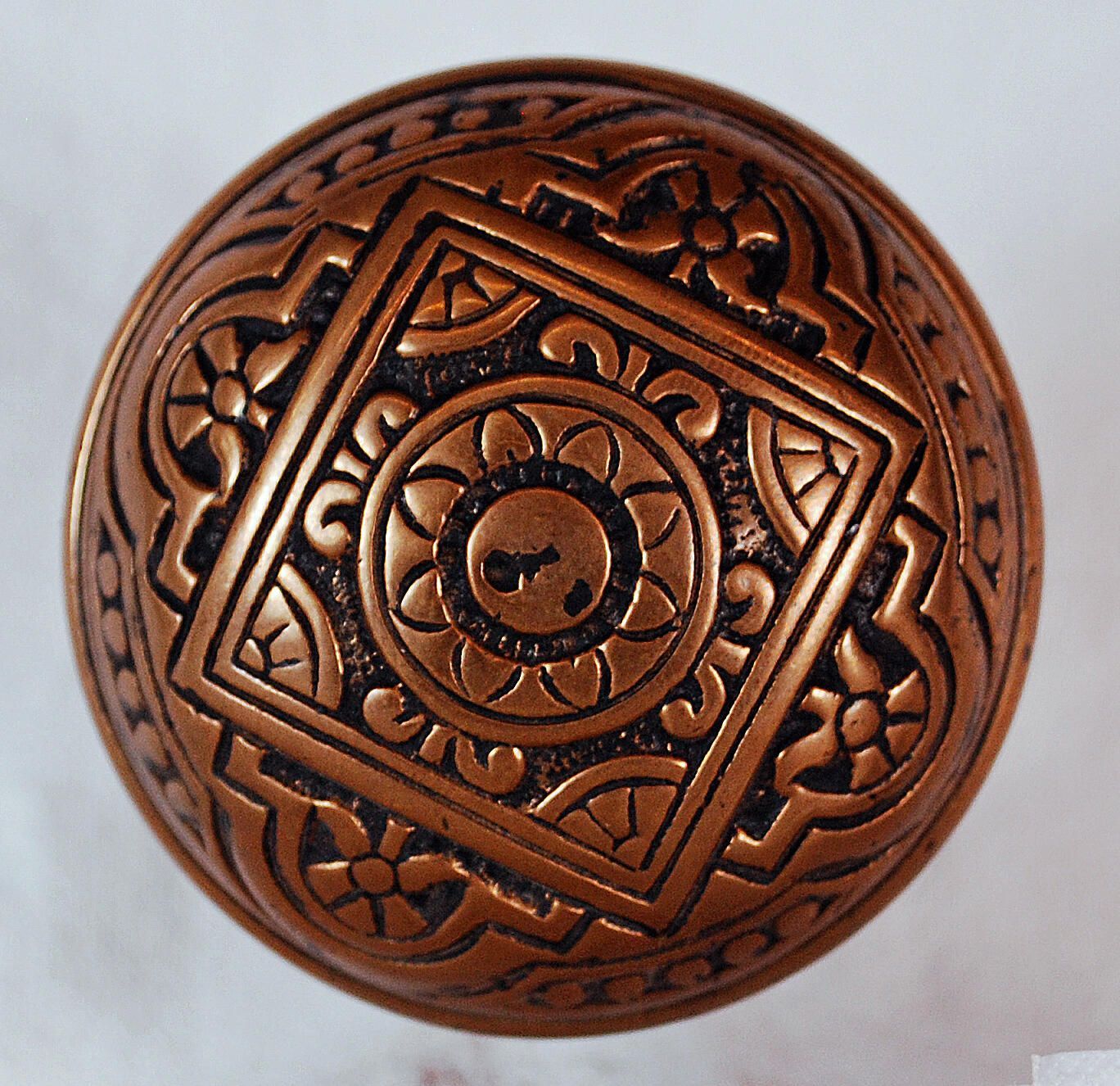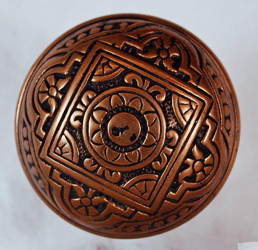 Design Name: Manufacture: P. & F. Corbin Style: Aesthetic Material: Bronze Manufacturing Method: Wrought / Stamped Surface Finish: Aged / Unpolished VDA Classification: Fourfold Symmetry VDA Number: H - 217 Shape: Domed / Drum Patent Specifics: Lock Type (If Applicable): Inscription/Makers Mark: Inscription Text: Comments: