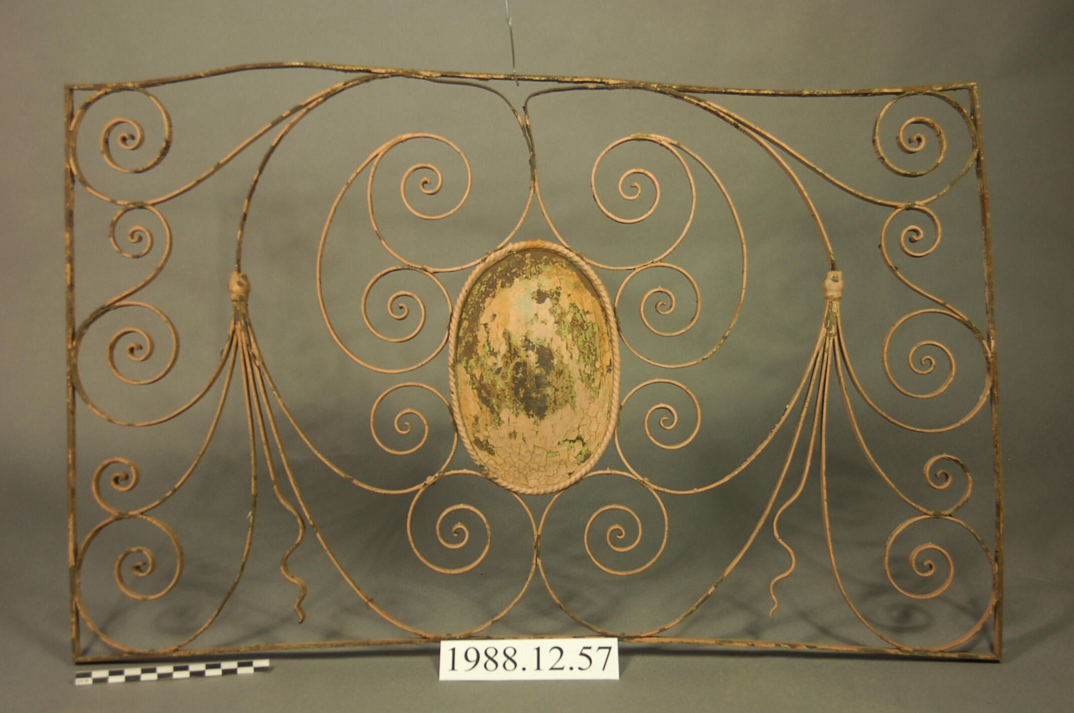 Iron / Steel rectangular frame. Scrolled infill. Central shield-shaped cartouche. Painted pink.