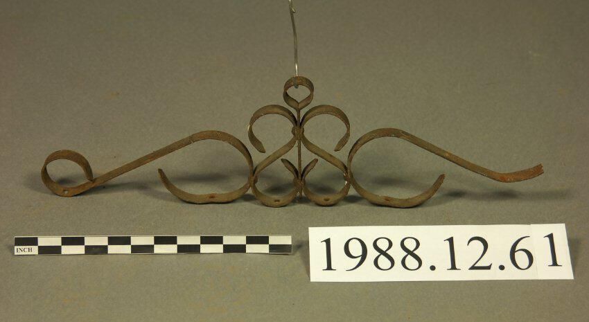 Iron / Steel Cresting from fence or gate. Symetrical scrolled strap. Riveted joints. Truncated end. Remnants of black paint.