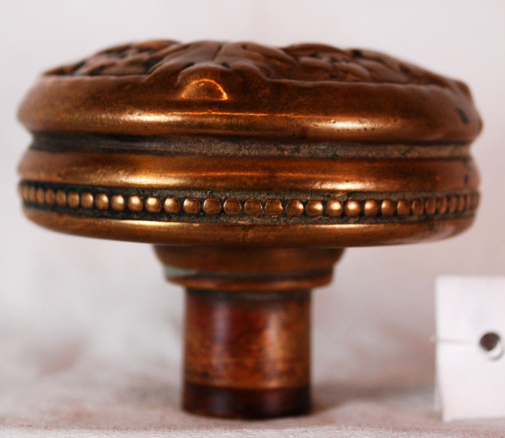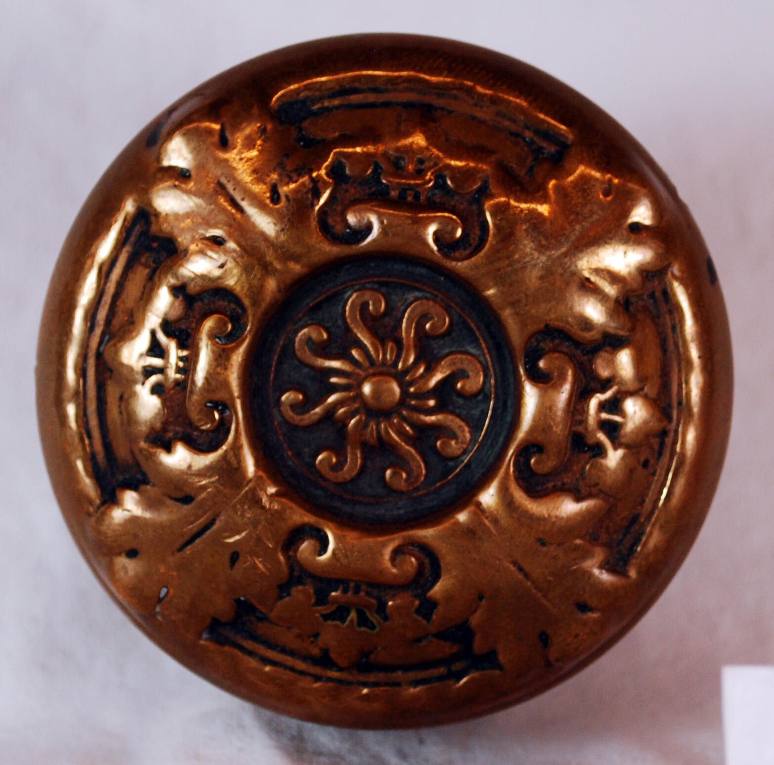 Design Name: St. Cloud Manufacture: P. & F. Corbin Style: Material: Bronze Manufacturing Method: Cast Surface Finish: Unpolished VDA Classification: Fourfold Symmetry VDA Number: H - 439 Shape: Domed / Drum Patent Specifics: Lock Type (If Applicable): Inscription/Makers Mark: Inscription Text: Comments: Compressed / Damaged. Pushed in From Back.