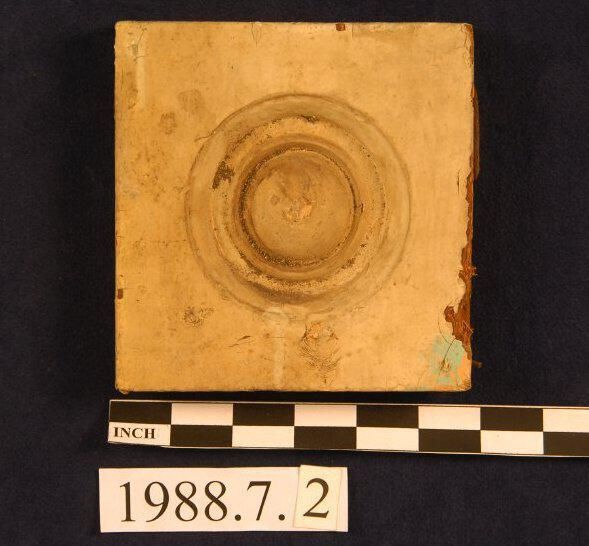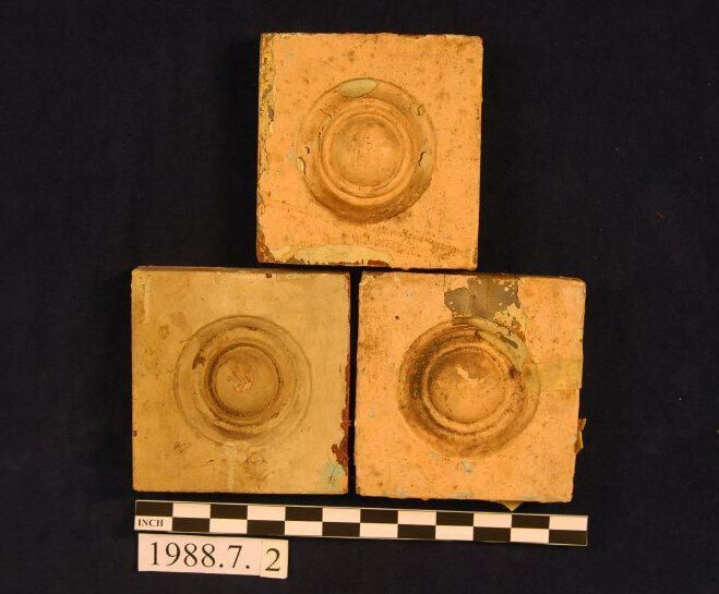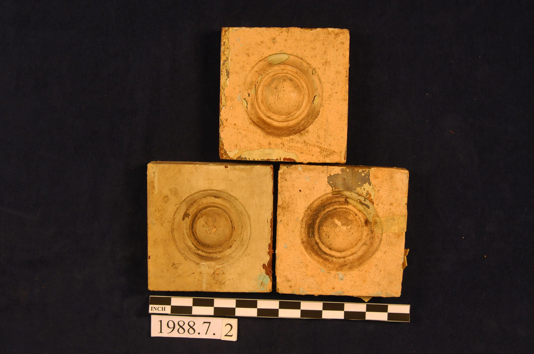 One lot of three square corner blocks. Bulls eye center. Cedar. Painted. One broken edge. One missing back edge. Inscriptions or Markings: Manufacturer: Place of Manufacturer: Design motif: Style: Finish: Painted.