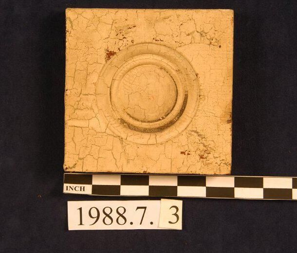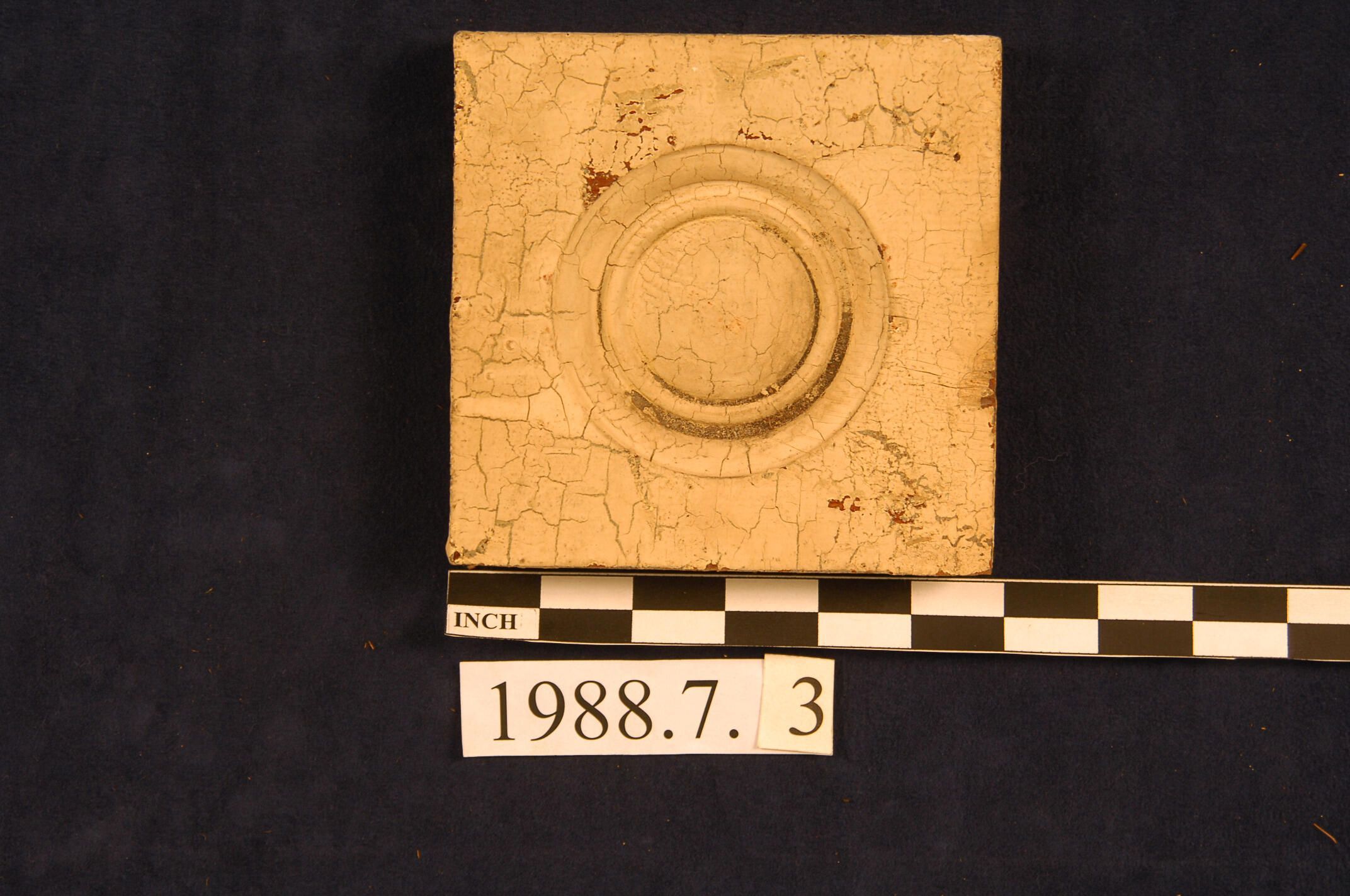 Square corner block. Bulls eye center. Cedar. Painted. Inscriptions or Markings: Manufacturer: Place of Manufacturer: Design motif: Style: Finish: Painted.