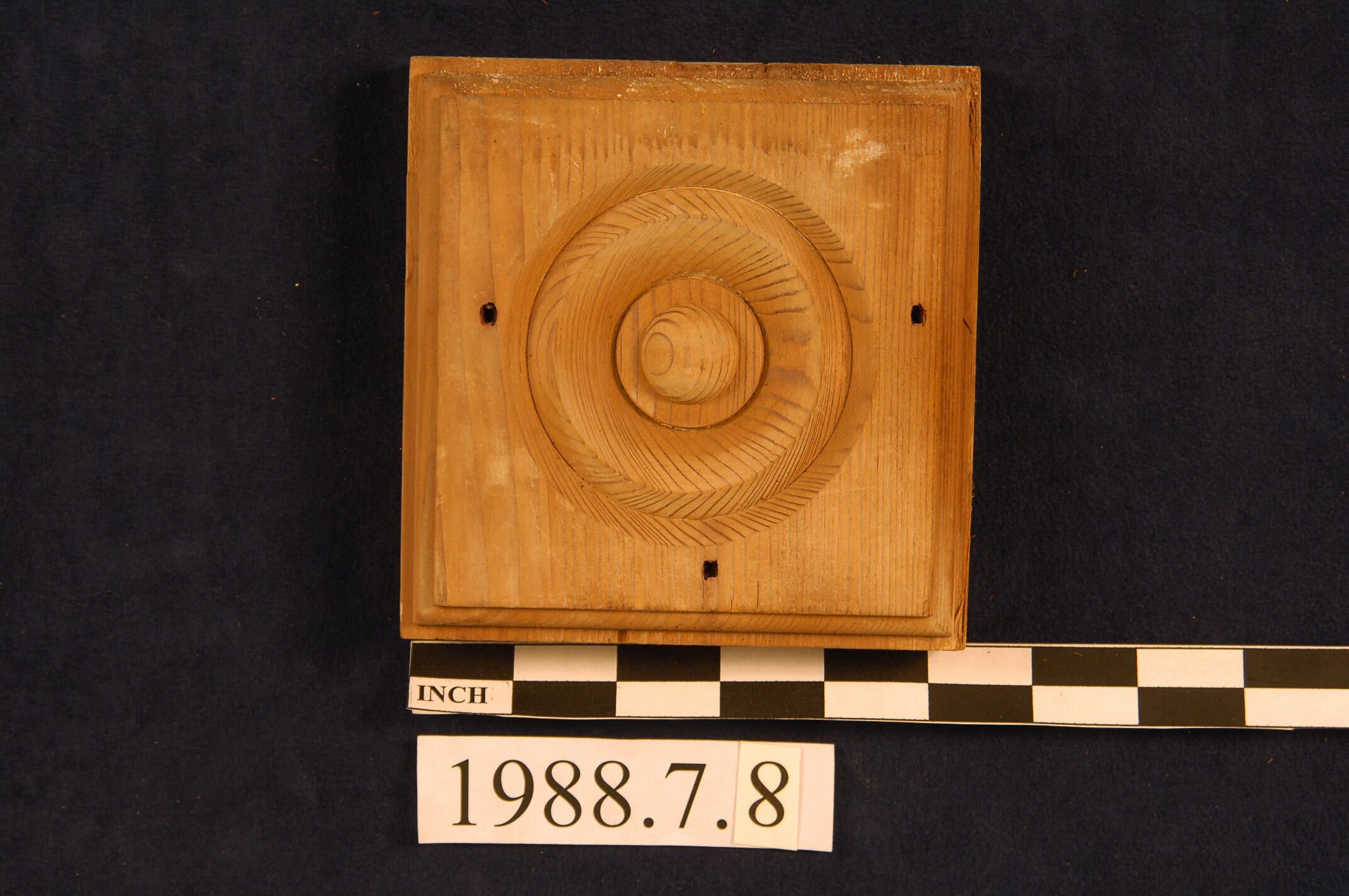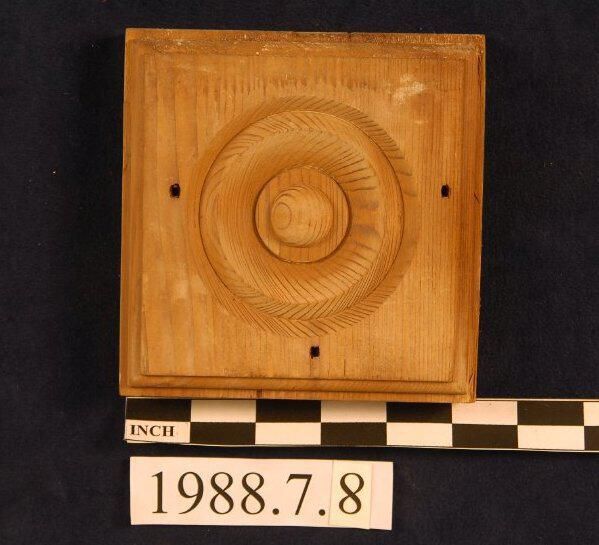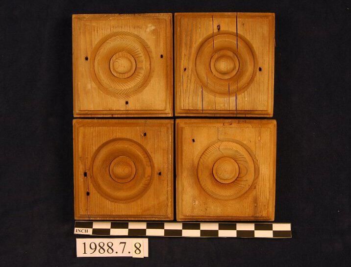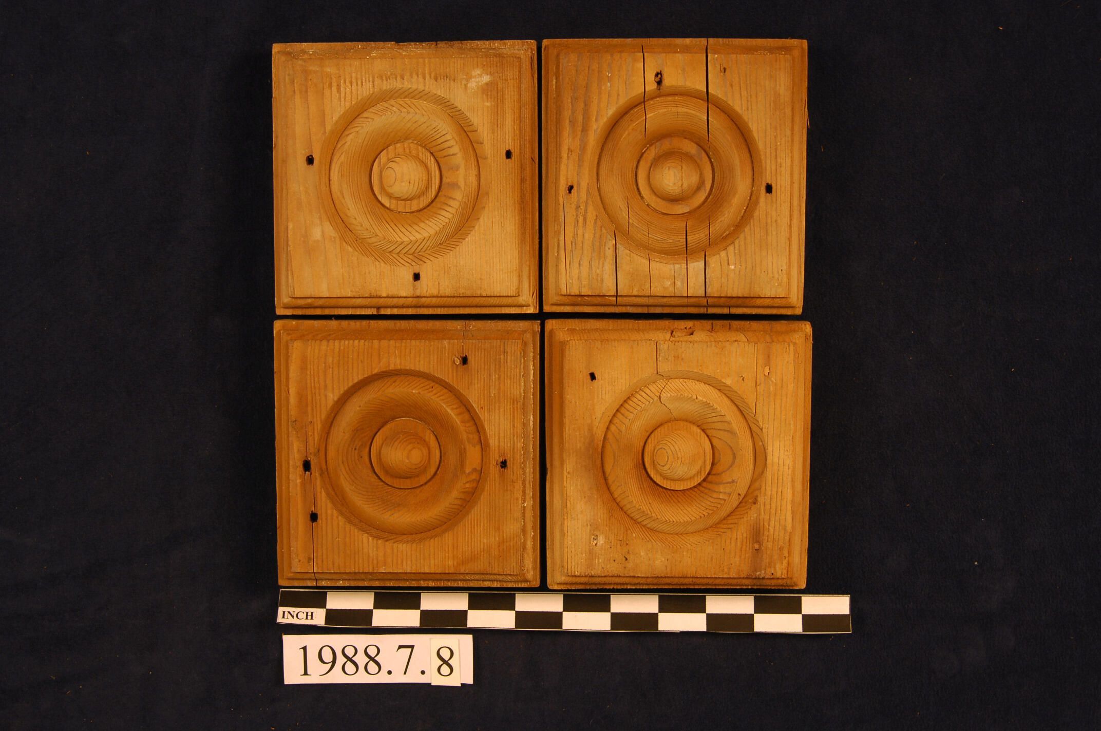 One lot of four square corner blocks. Bulls eye center. Cedar. Molded edges. Stripped. Inscriptions or Markings: Manufacturer: Place of Manufacturer: Design motif: Style: Finish: Stripped.