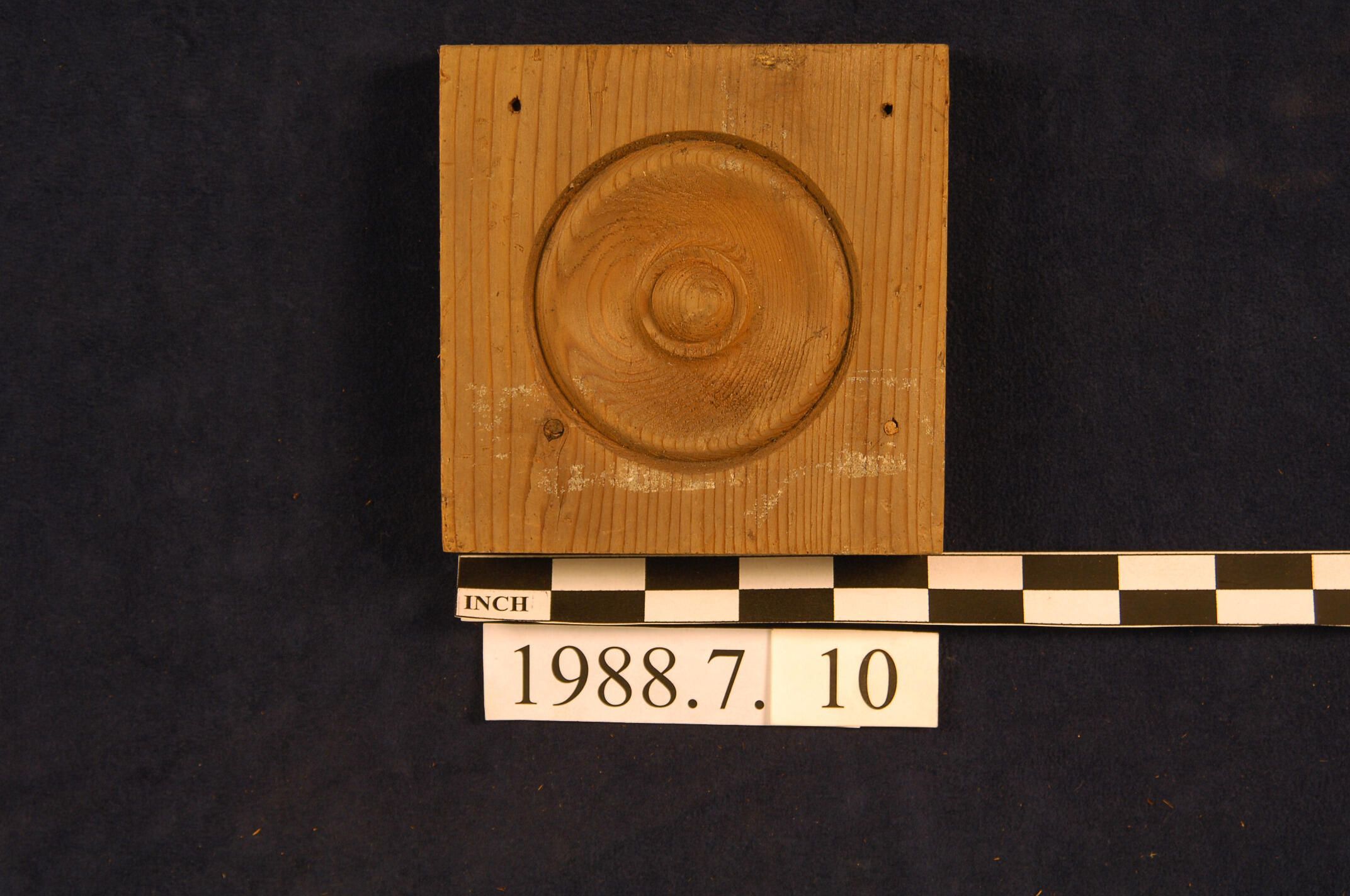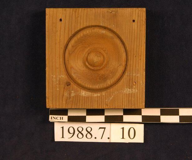 Square corner block. Bulls eye center. Cedar. Inscriptions or Markings: Manufacturer: Place of Manufacturer: Design motif: Style: Finish: Stripped.