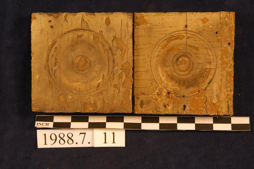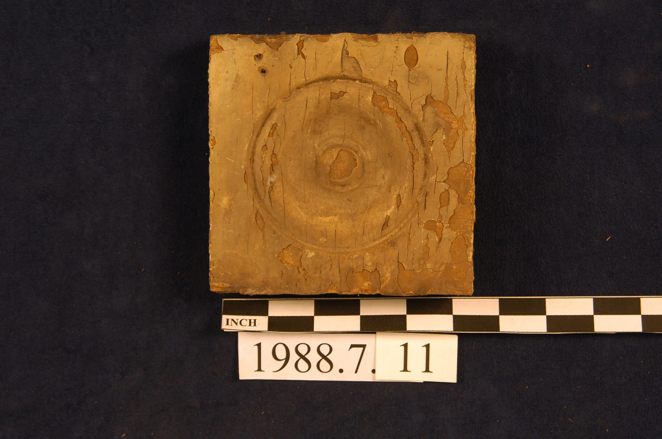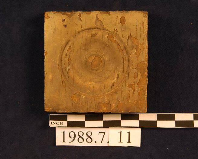 One lot of two square corner blocks. Bulls eye center. Cedar. Painted. Inscriptions or Markings: Manufacturer: Place of Manufacturer: Design motif: Style: Finish: Painted.