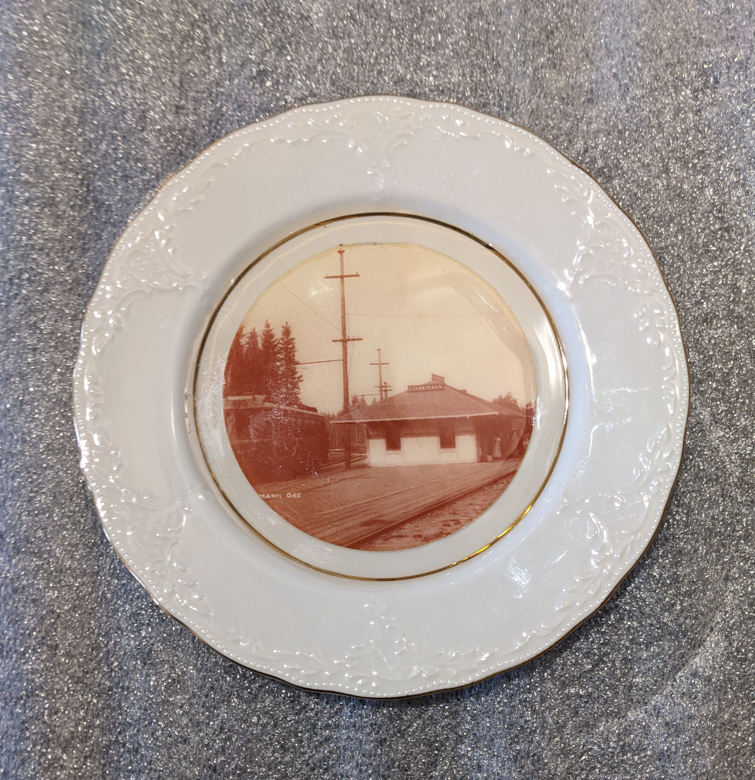 White souvenir china plate with image of Linneman Station (near Gresham, OR) in center. Appears to be an image that was cropped to fit in the center of the plate and then lacquered into place.