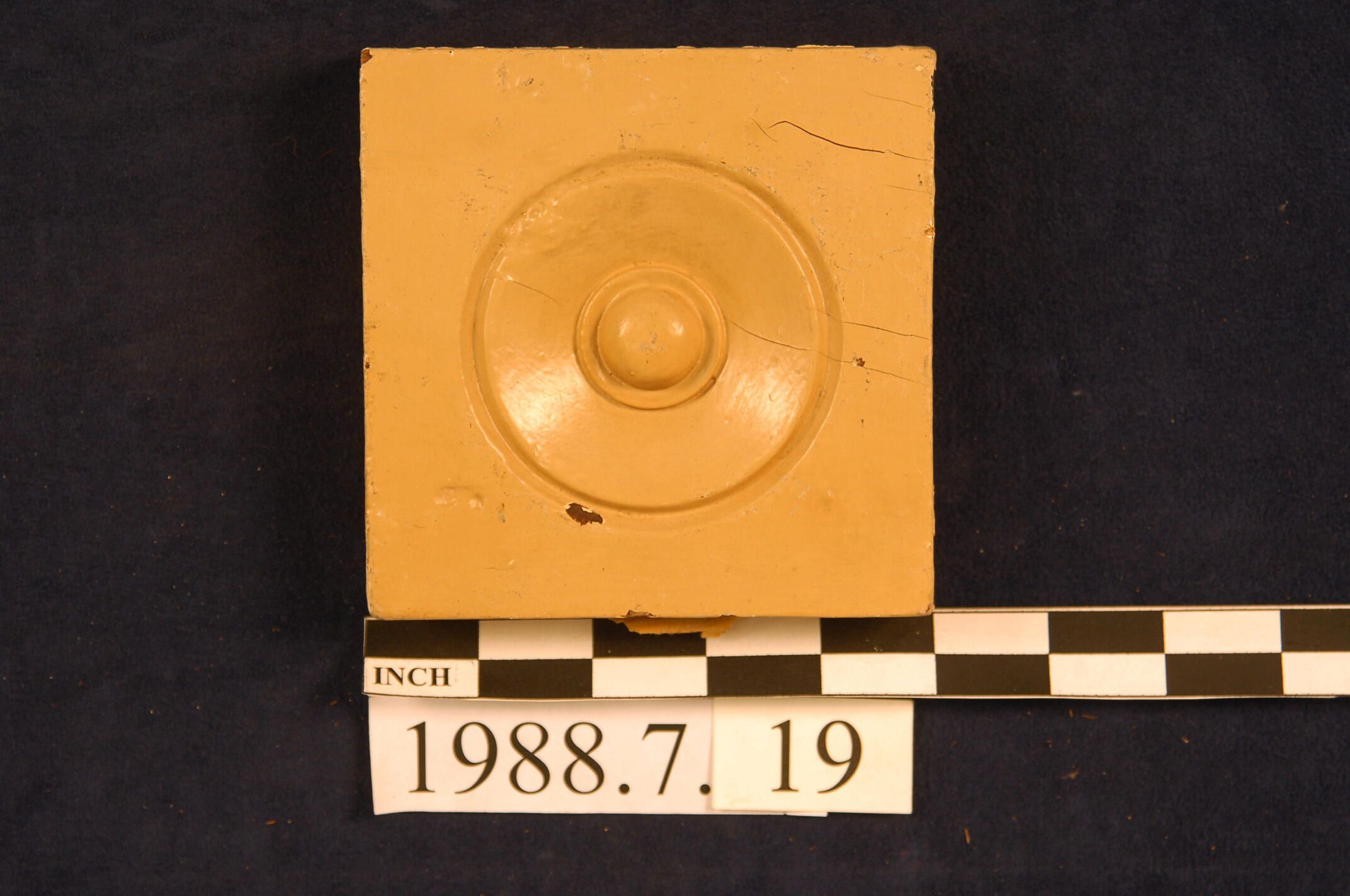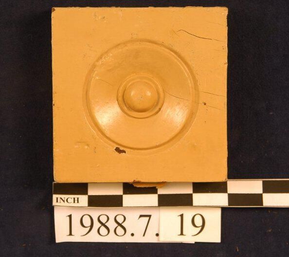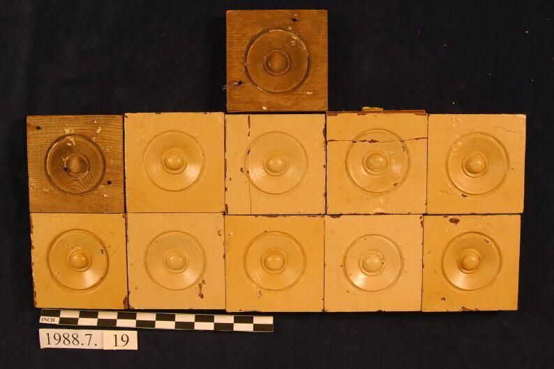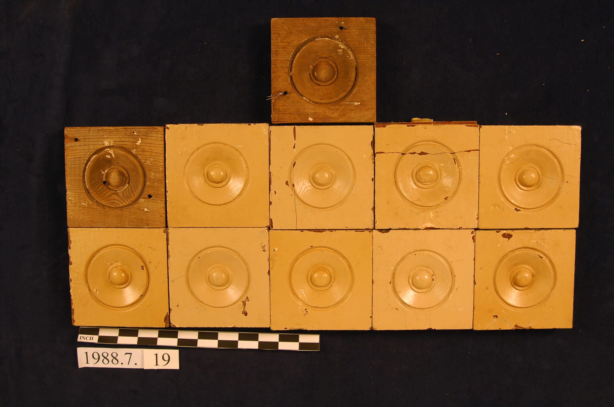 One lot of nine square corner blocks. Bulls eye center. Cedar. Two with slits. Two stripped. Seven painted. Inscriptions or Markings: Manufacturer: Place of Manufacturer: Design motif: Style: Finish: Painted.