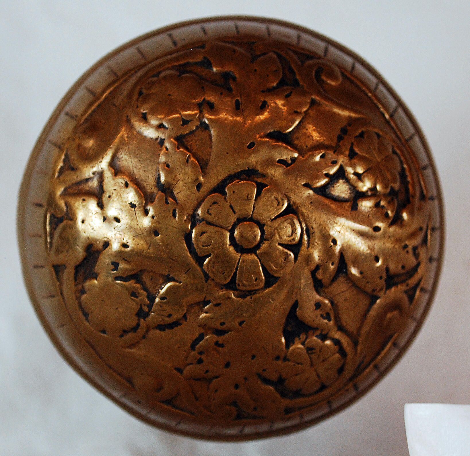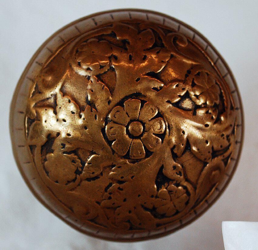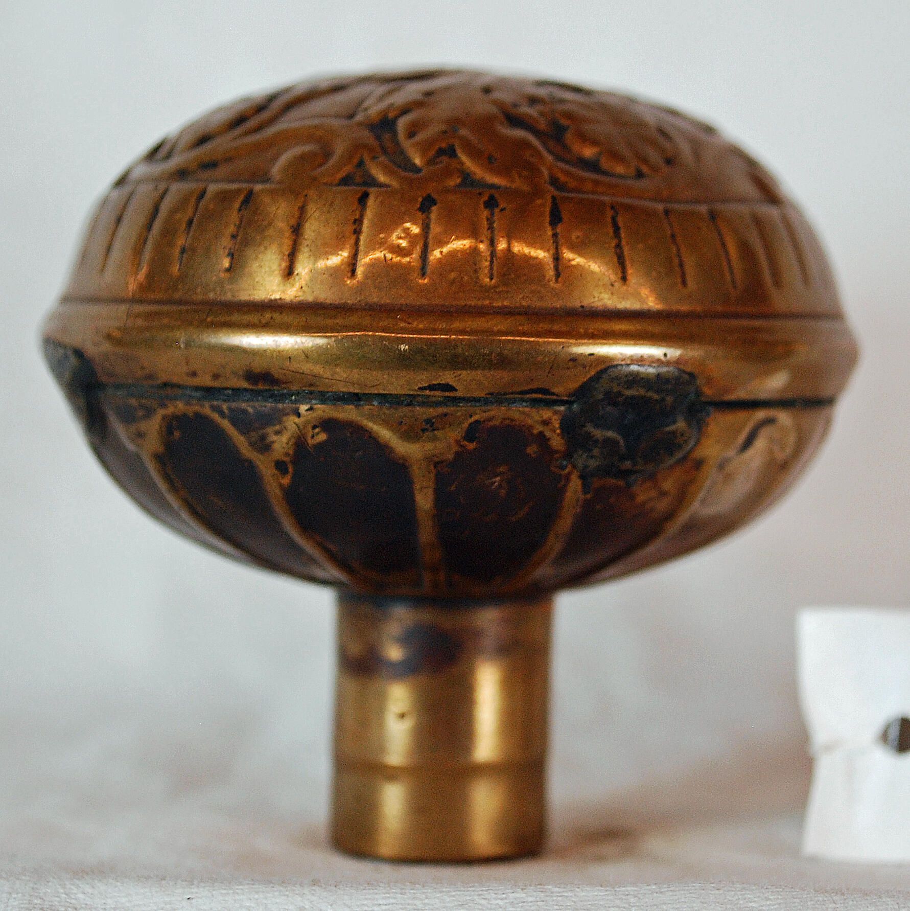Design Name: Manufacture: Reading Hdwr. Co. Style: Vernacular Material: Brass Manufacturing Method: Cast Surface Finish: Unpolished VDA Classification: Fourfold Symmetry VDA Number: H - 256 Shape: Domed Patent Specifics: Pat. Number 16,892 by J. Lochner Sept. 7, 1886 Lock Type (If Applicable): Inscription/Makers Mark: Inscription Text: Comments: .Three Piece. Much Wear.