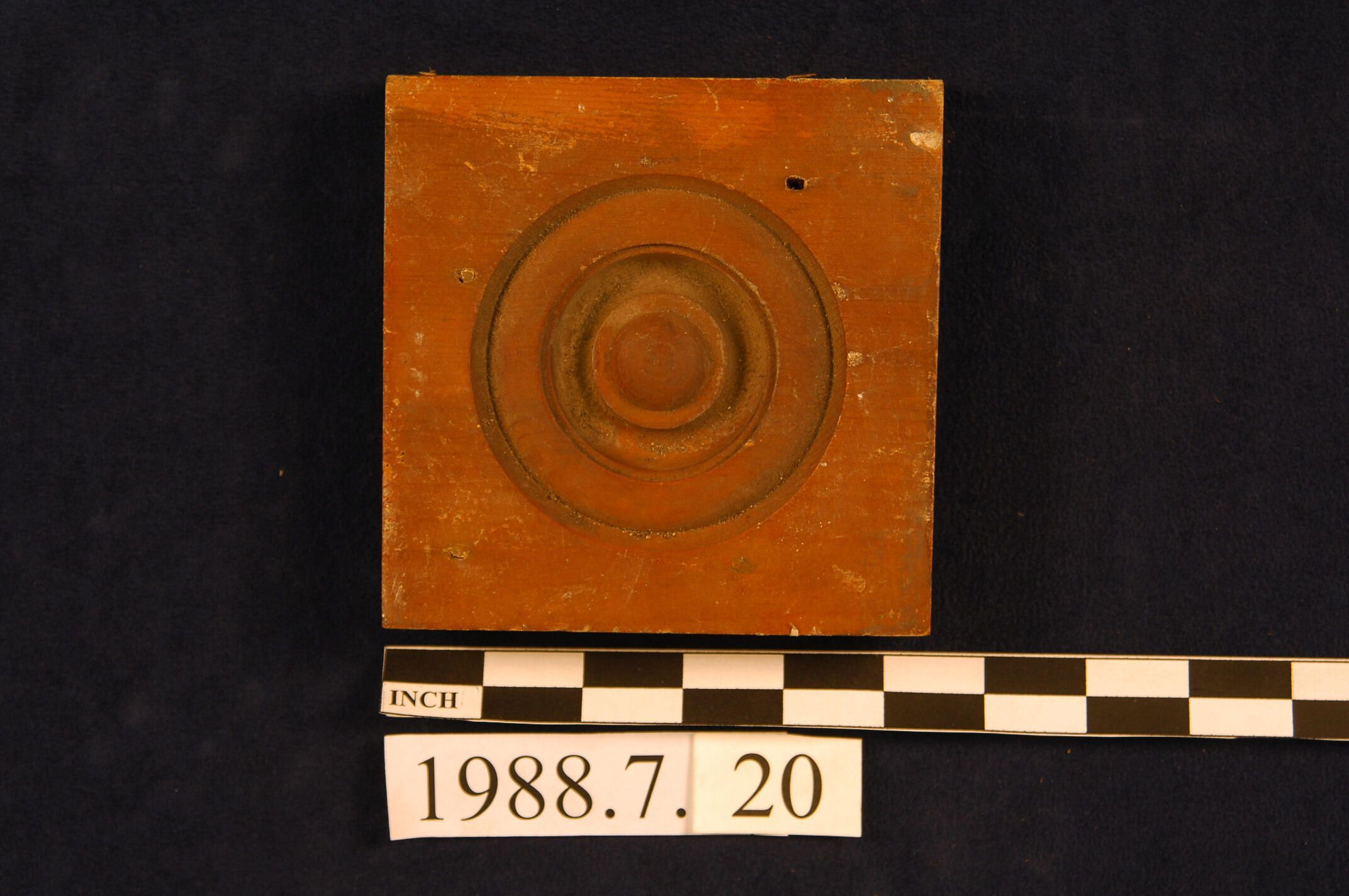 Square Ccrner block. Bulls eye center. Cedar? Stained. Varnished. Inscriptions or Markings: Manufacturer: Place of Manufacturer: Design motif: Style: Finish: Varnished.