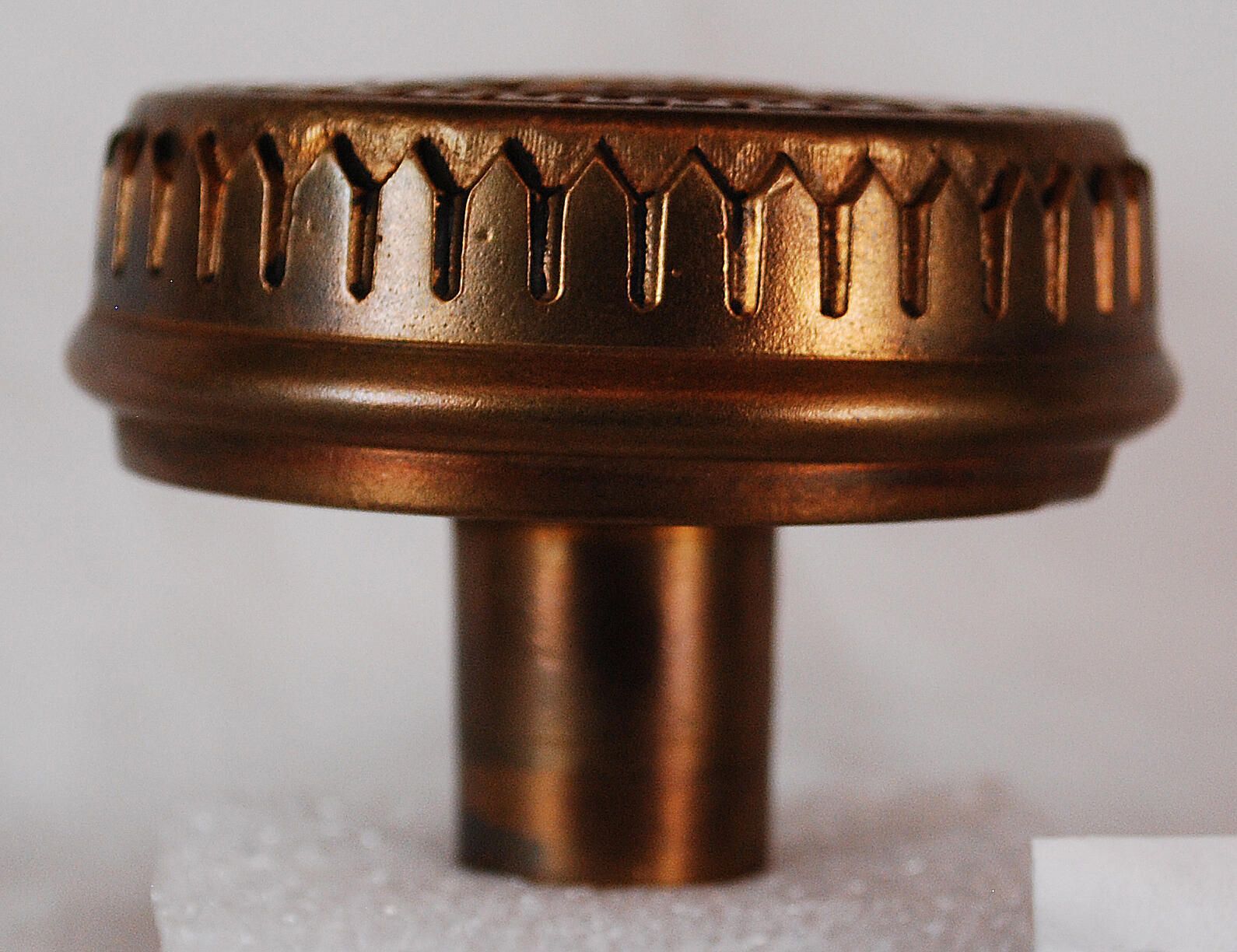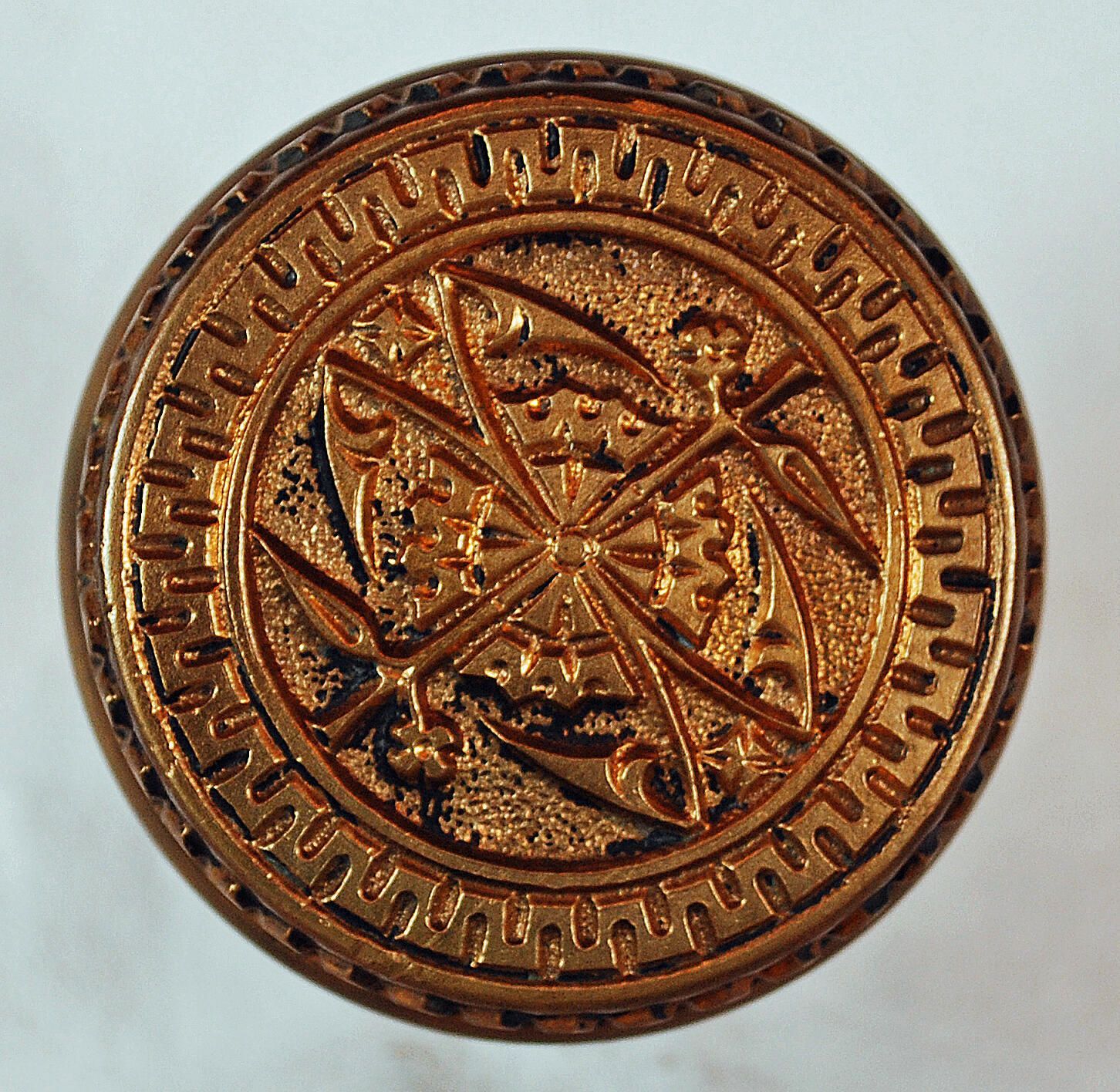 Design Name: Manufacture: Branford Lock Works Style: Aesthetic Material: Bronze Manufacturing Method: Cast Surface Finish: Aged / Unpolished VDA Classification: Fourfold Symmetry VDA Number: H - 201 Shape: Drum Patent Specifics: Lock Type (If Applicable): Inscription/Makers Mark: Inscription Text: Comments: Collapsed Back.