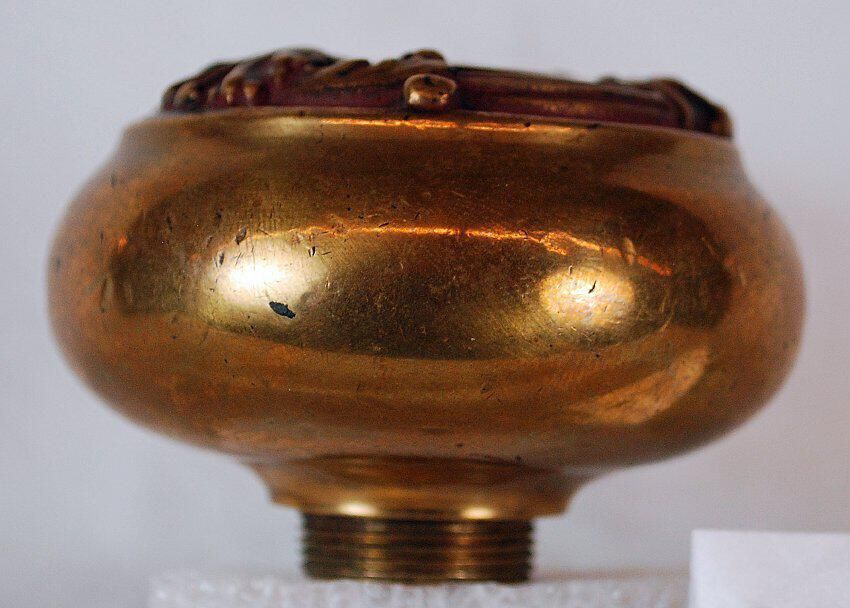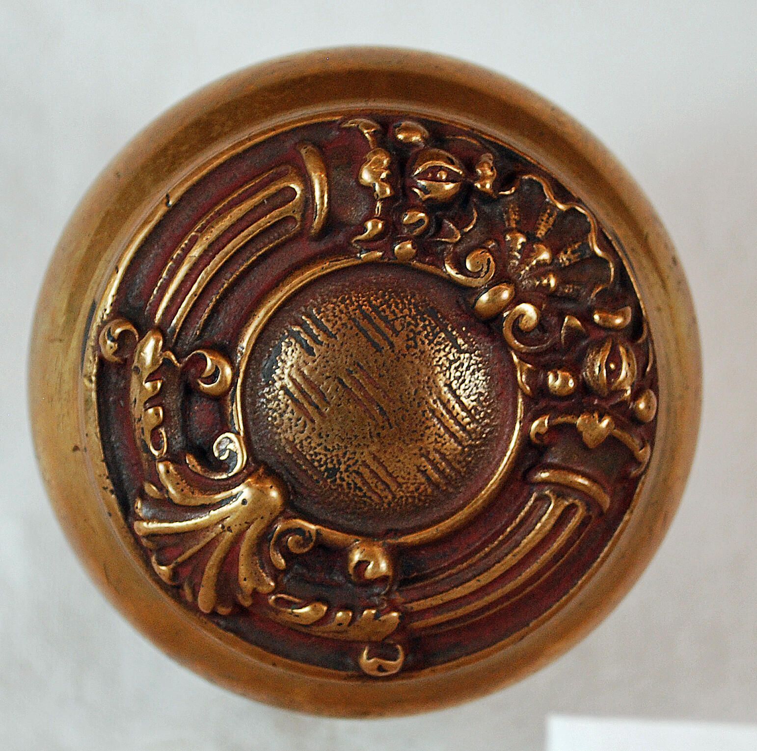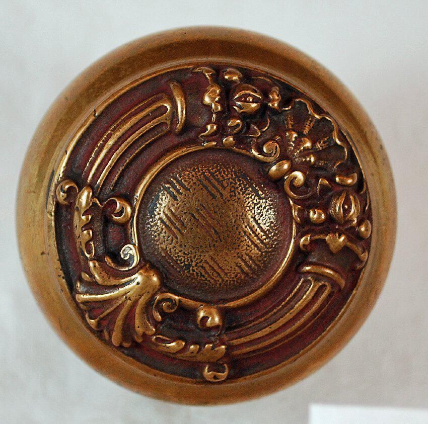 Design Name: Bramante Manufacture: Russell & Erwin Mfg. Co. Style: Italian Renaissance Material: Brass Manufacturing Method: Cast Surface Finish: Painted VDA Classification: Twofold Symmetry VDA Number: E - 231 Shape: Domed Patent Specifics: Lock Type (If Applicable): Inscription/Makers Mark: Inscription Text: Comments: Red painted in Relief on Face. Propriatory Threaded Shank. Shank Sleeve Missing.