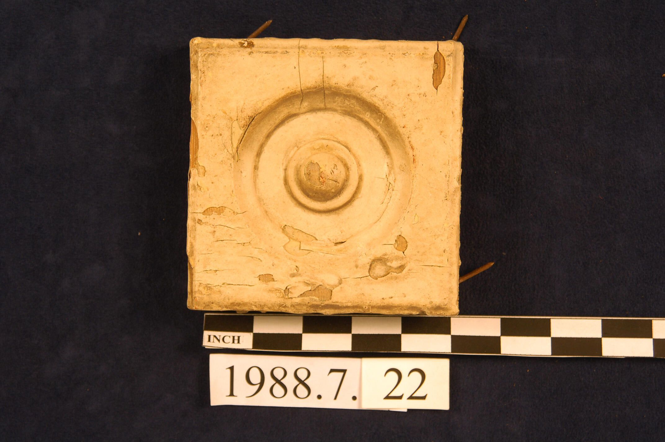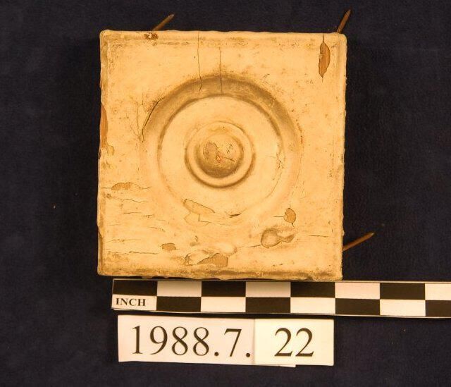 Square corner block. Bulls eye center. Molded edges (cove). Cedar. Painted. Wire nails. Inscriptions or Markings: Manufacturer: Place of Manufacturer: Design motif: Style: Finish: Painted.