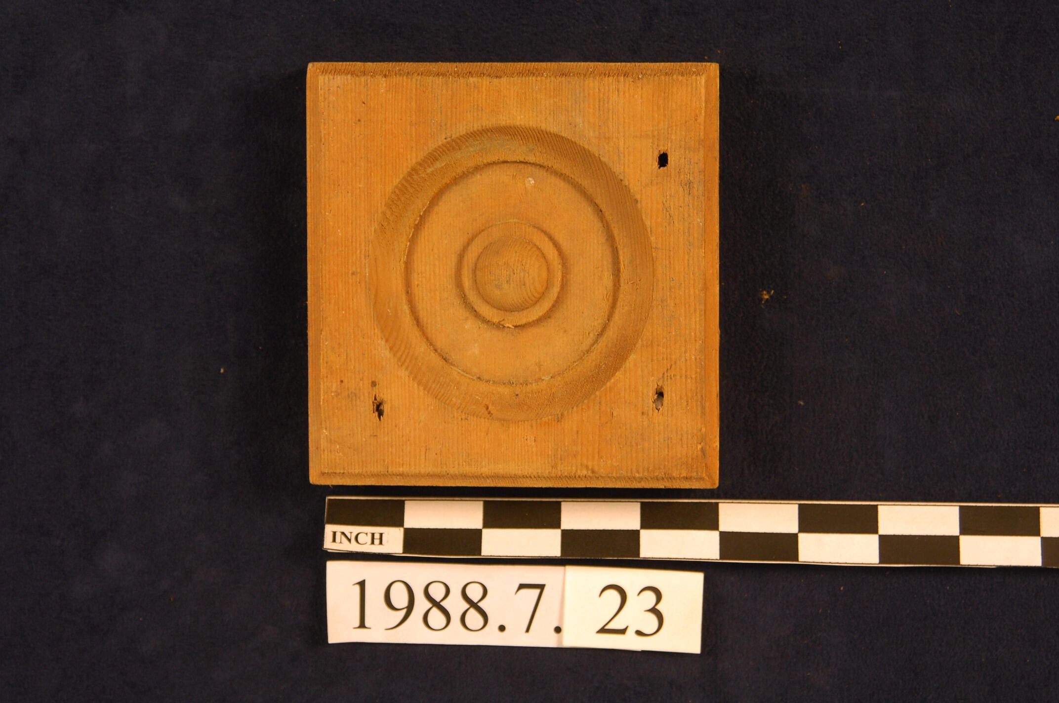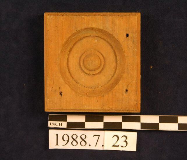 Square corner block. Bulls eye center. Molded edges. Cedar? Stripped. Inscriptions or Markings: Manufacturer: Place of Manufacturer: Design motif: Style: Finish: Stripped.