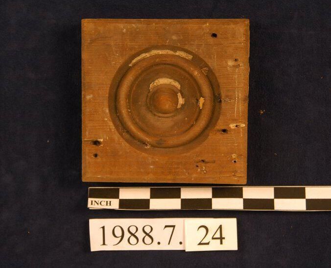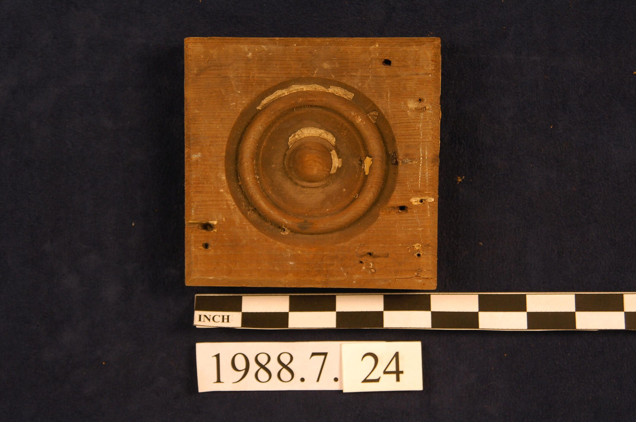 Square corner block. Bulls eye center. Beveled edges. Cedar. Remnants of paint. Inscriptions or Markings: Manufacturer: Place of Manufacturer: Design motif: Style: Finish: Painted.