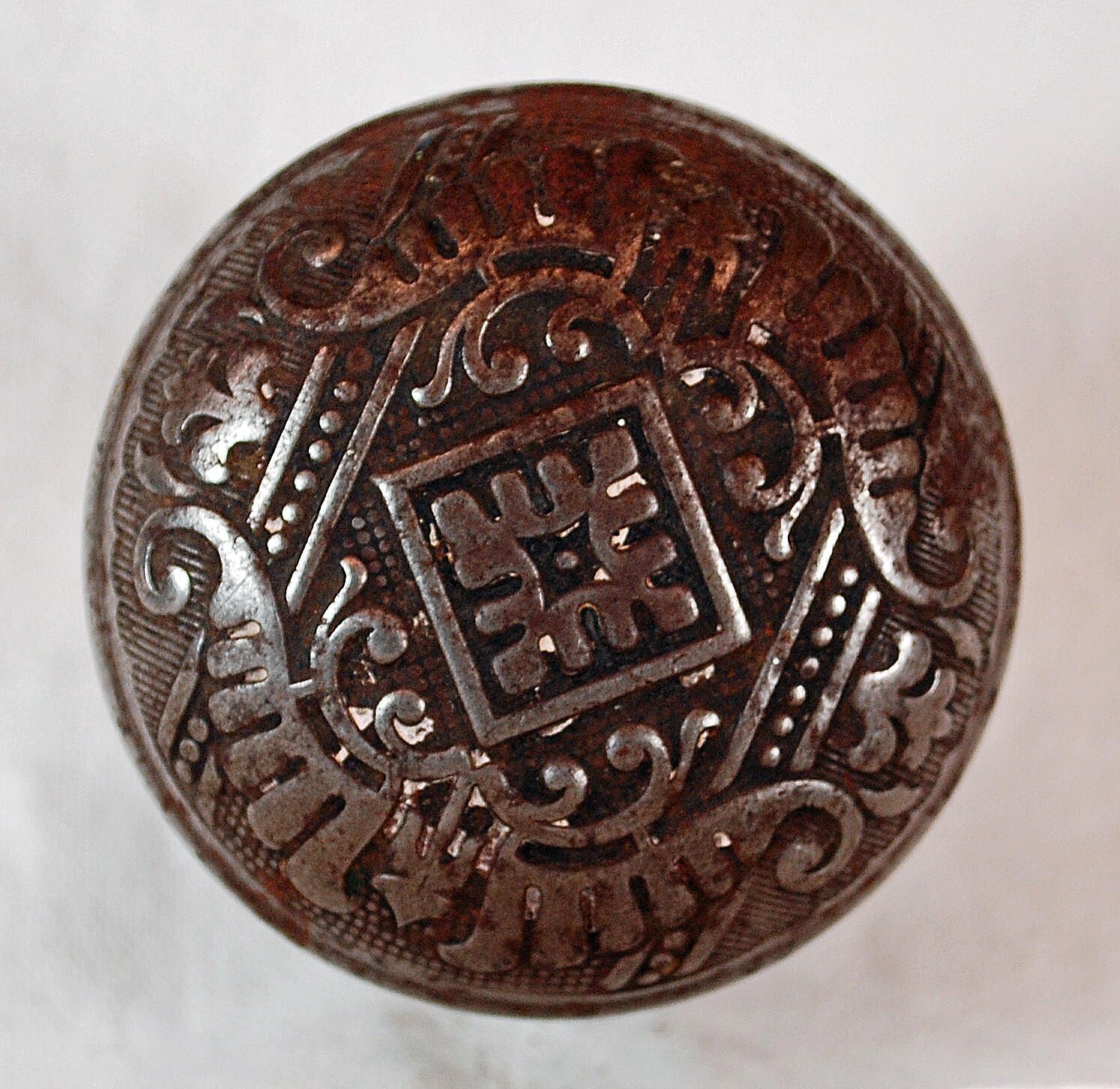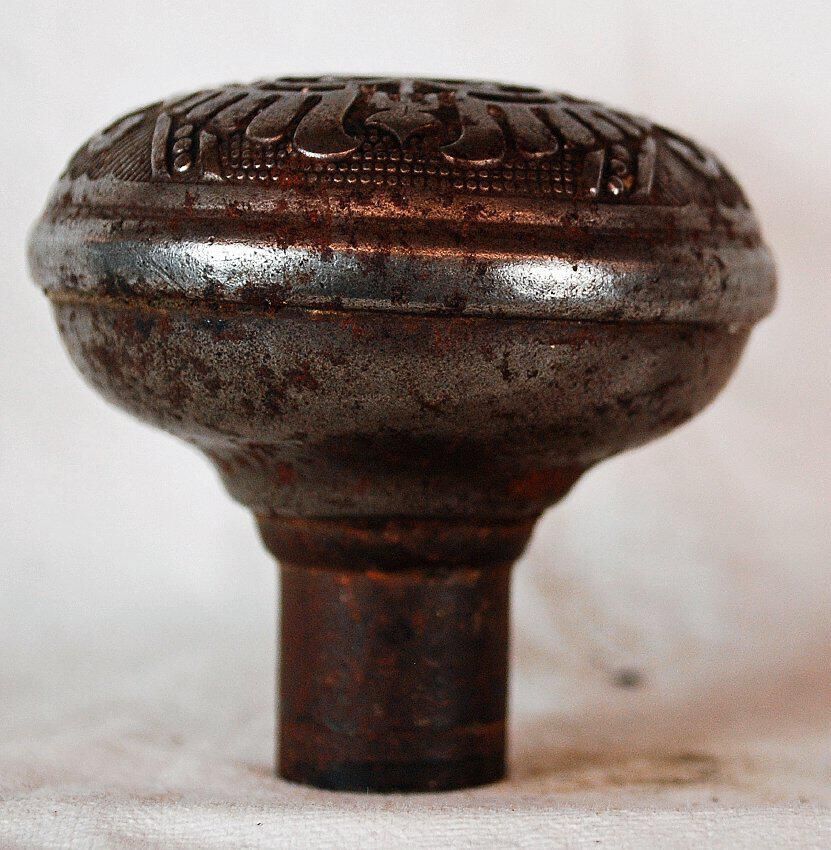 Design Name: Canton Manufacture: P. & F. Corbin Style: Material: Steel Manufacturing Method: Stamped Surface Finish: Unpolished VDA Classification: Twofold Symmetry VDA Number: F - 108 Shape: Domed Patent Specifics: Lock Type (If Applicable): Inscription/Makers Mark: Inscription Text: Comments: Two Piece Steel With Cast Shank. Rust.
