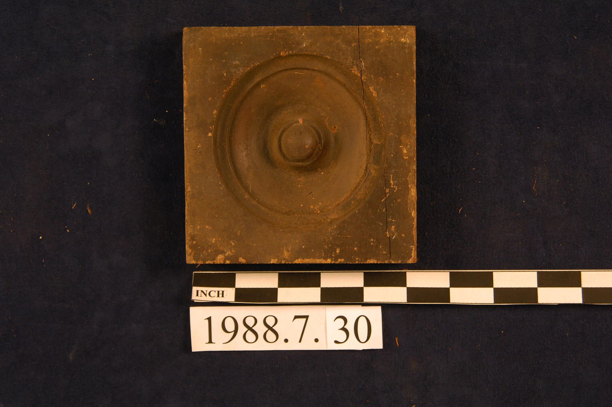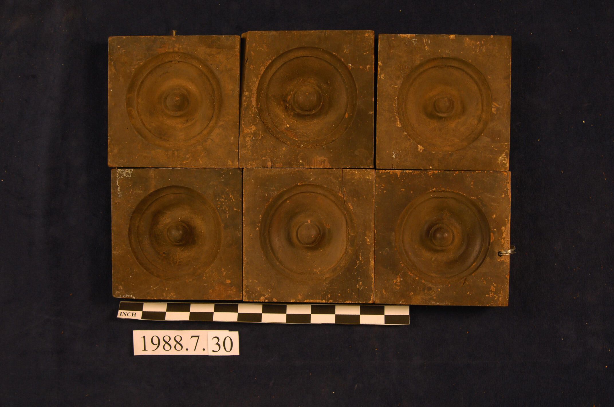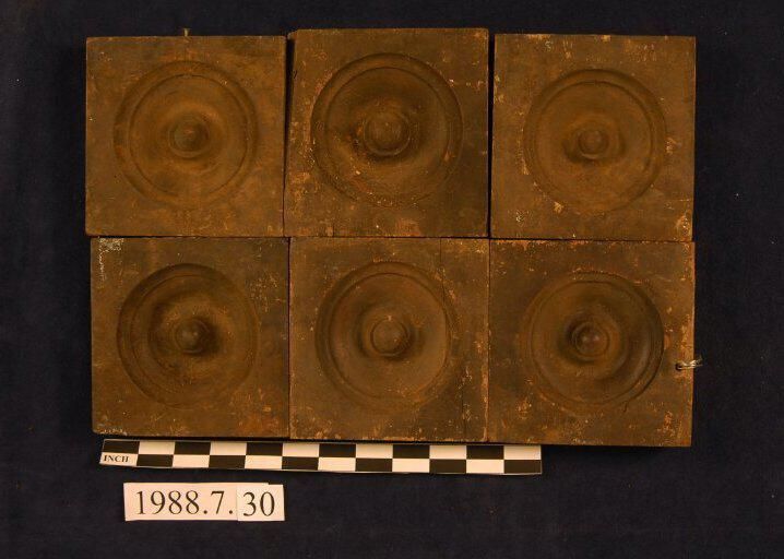 One lot of six square corner blocks. Bulls eye center. Cedar? Varnished. Inscriptions or Markings: Manufacturer: Place of Manufacturer: Design motif: Style: Finish: Varnished.