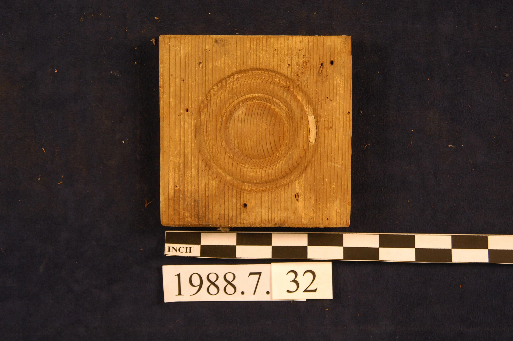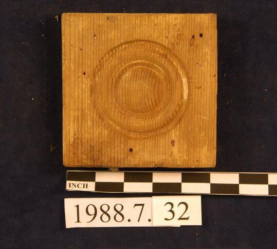 Square corner block. Bulls eye center. Slightly beveled edges. Partially stripped paint. Missing back edge. Inscriptions or Markings: Manufacturer: Place of Manufacturer: Design motif: Style: Finish: Painted.