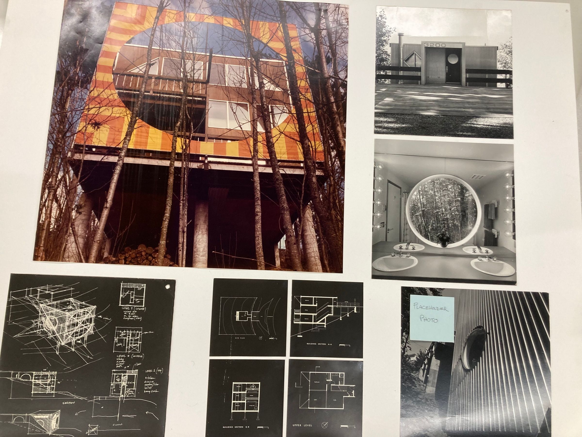 List of items in set: Presentation board; Title block; Project statement; Axonometric drawing; Intermediate level floorplan; Lower level floorplan; Photo of kitchen