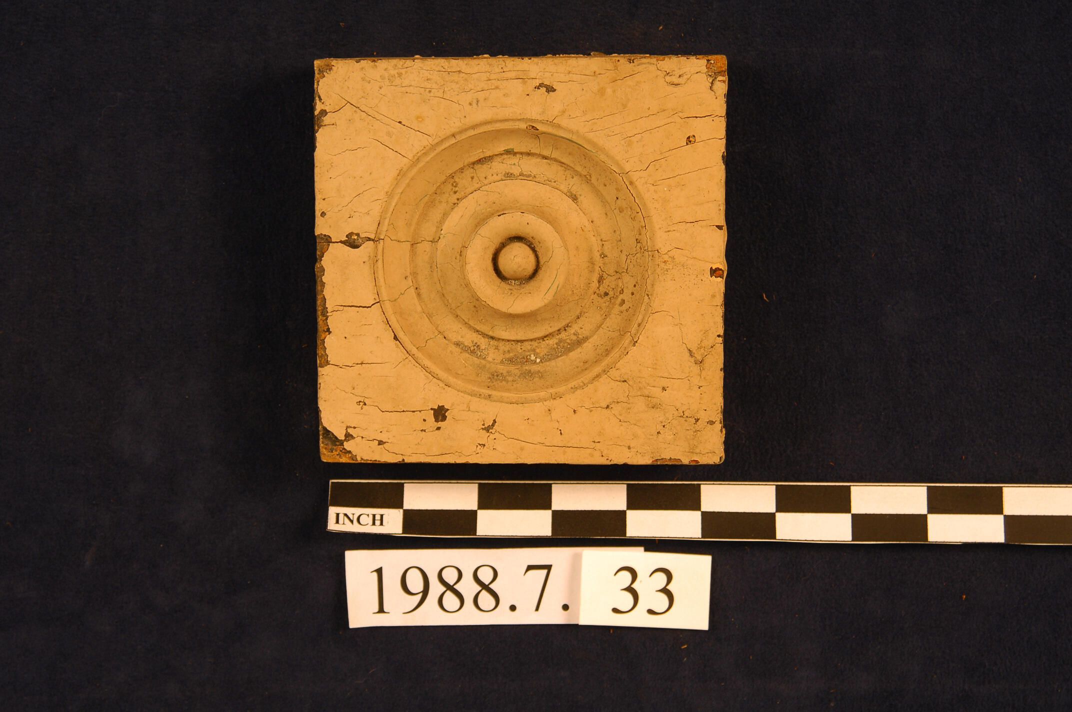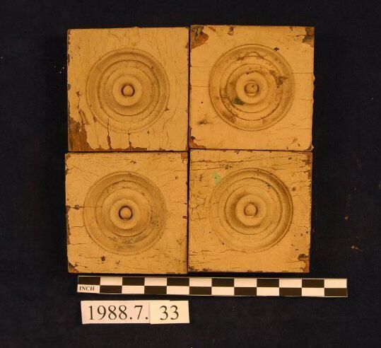 One lot of four square corner blocks. Bulls eye center. Cedar or Pine. Painted. Wire nails. Inscriptions or Markings: Manufacturer: Place of Manufacturer: Design motif: Style: Finish: Painted.