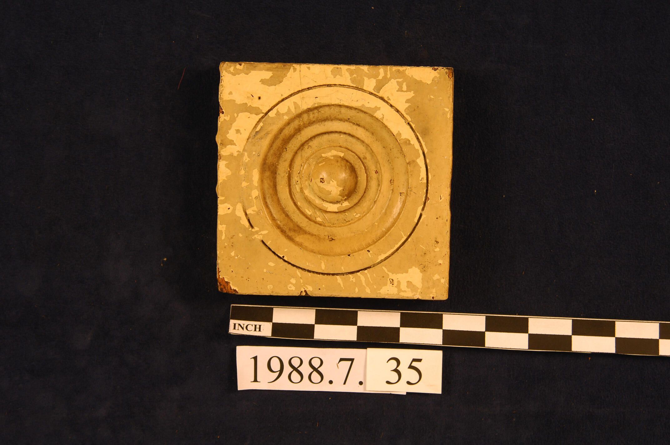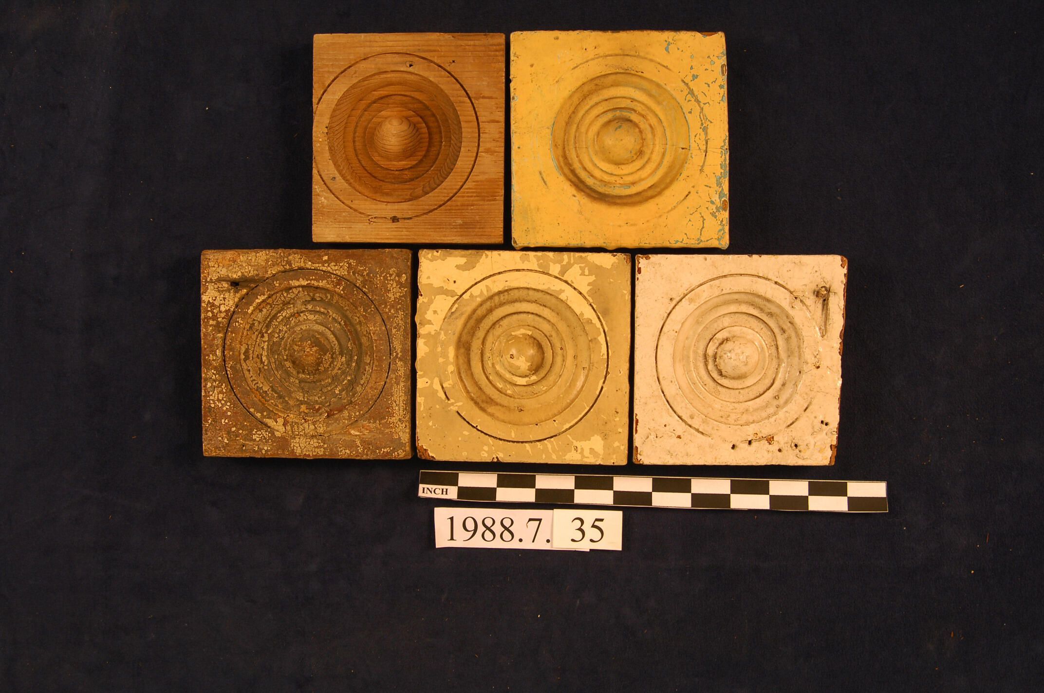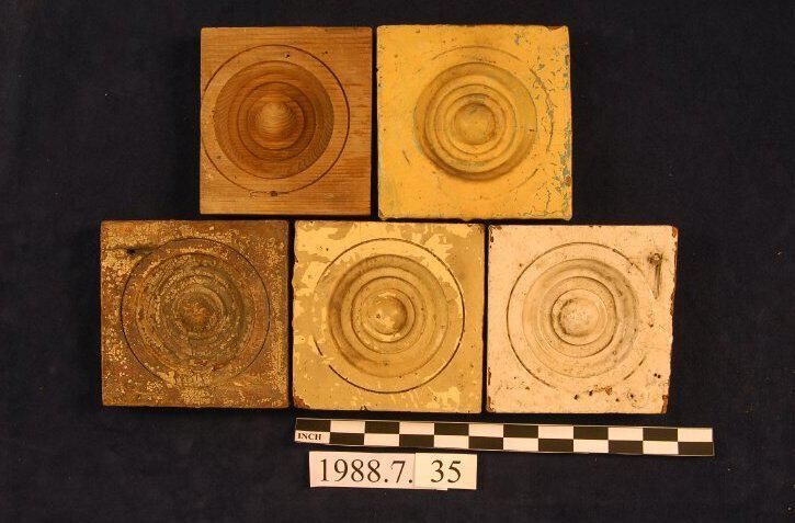 One lot of five square corner blocks. Bulls eye center. Cedar. Four are painted. One cut short and stripped. Two missing edges. Inscriptions or Markings: Manufacturer: Place of Manufacturer: Design motif: Style: Finish: Painted.