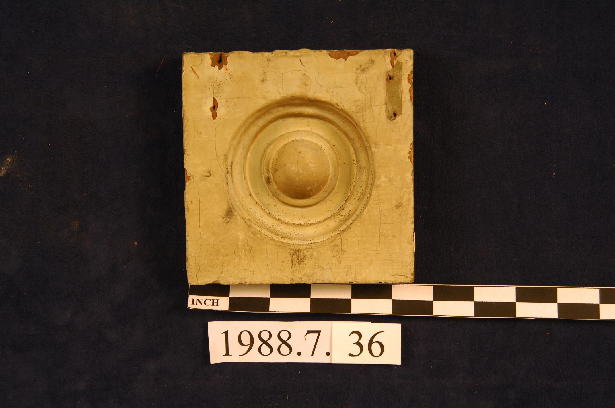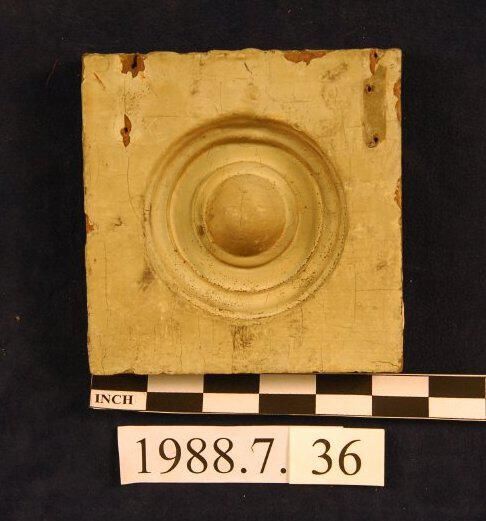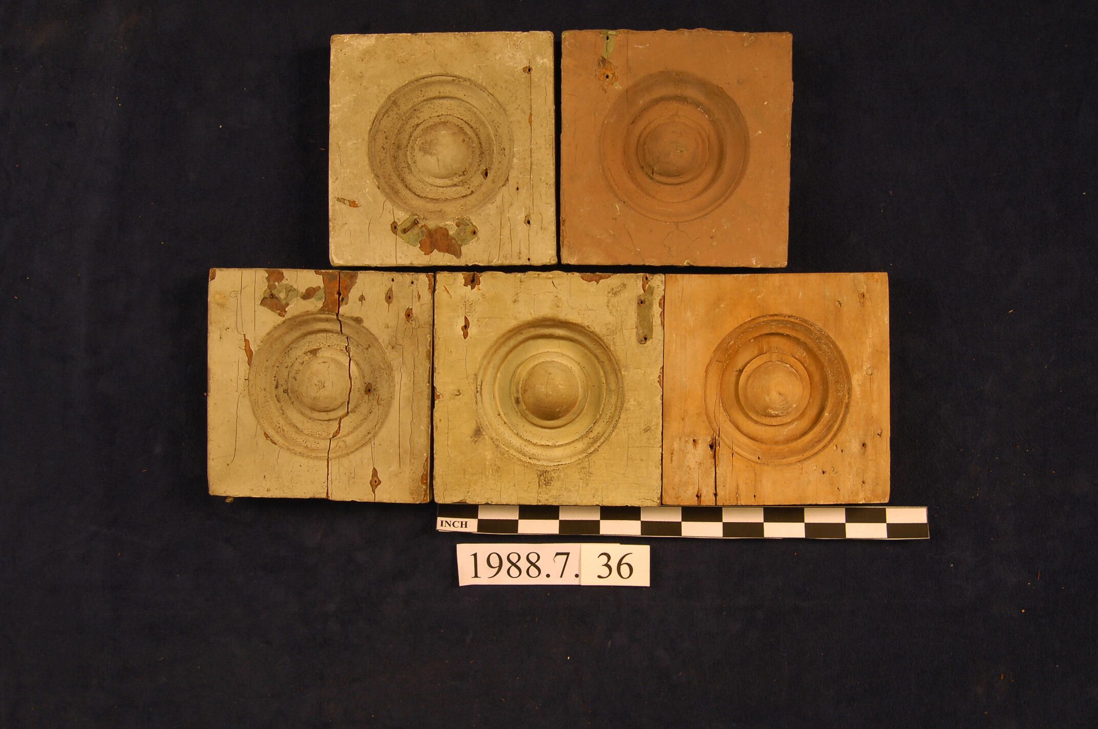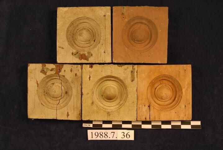 One lot of five square corner blocks. Bulls eye center. Pine? Three are painted. One is split. One stripped. Inscriptions or Markings: Manufacturer: Place of Manufacturer: Design motif: Style: Finish: Painted.