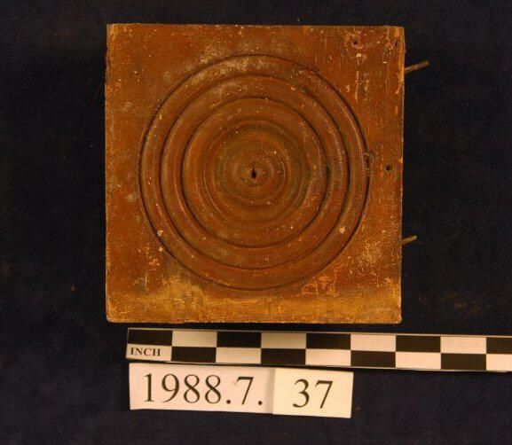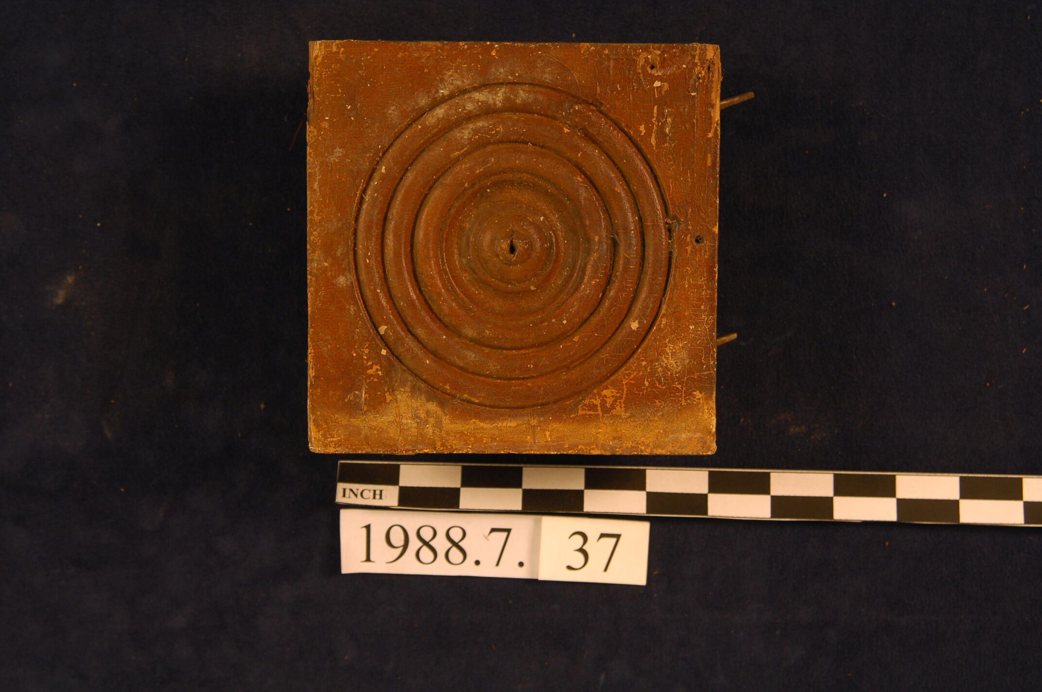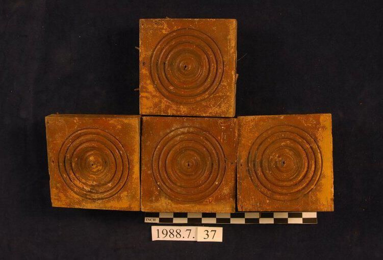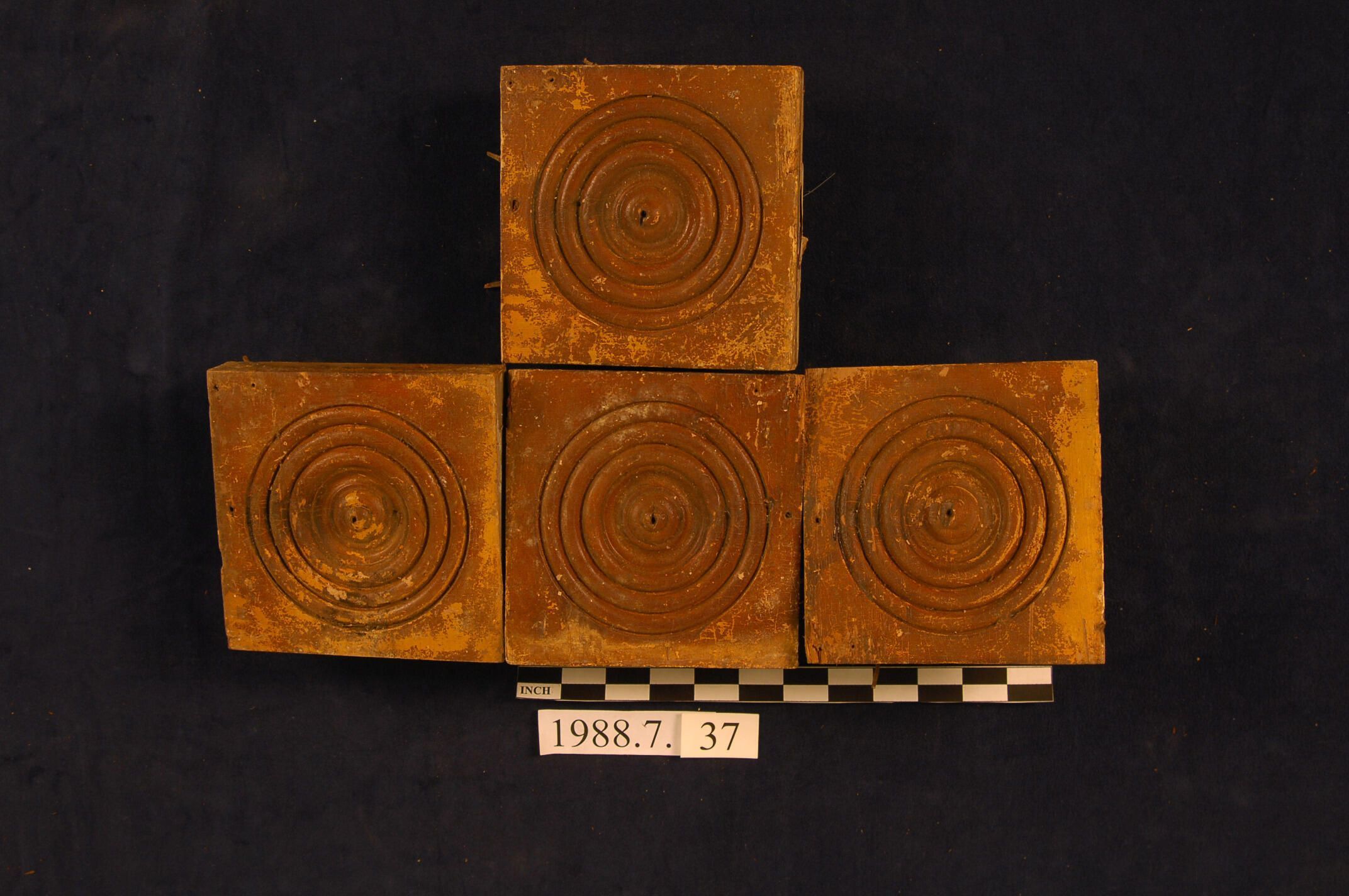 One lot of four square corner blocks. Bulls eye center. Cedar. Varnished. Square nails. Inscriptions or Markings: Manufacturer: Place of Manufacturer: Design motif: Style: Finish: Varnished.