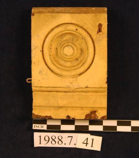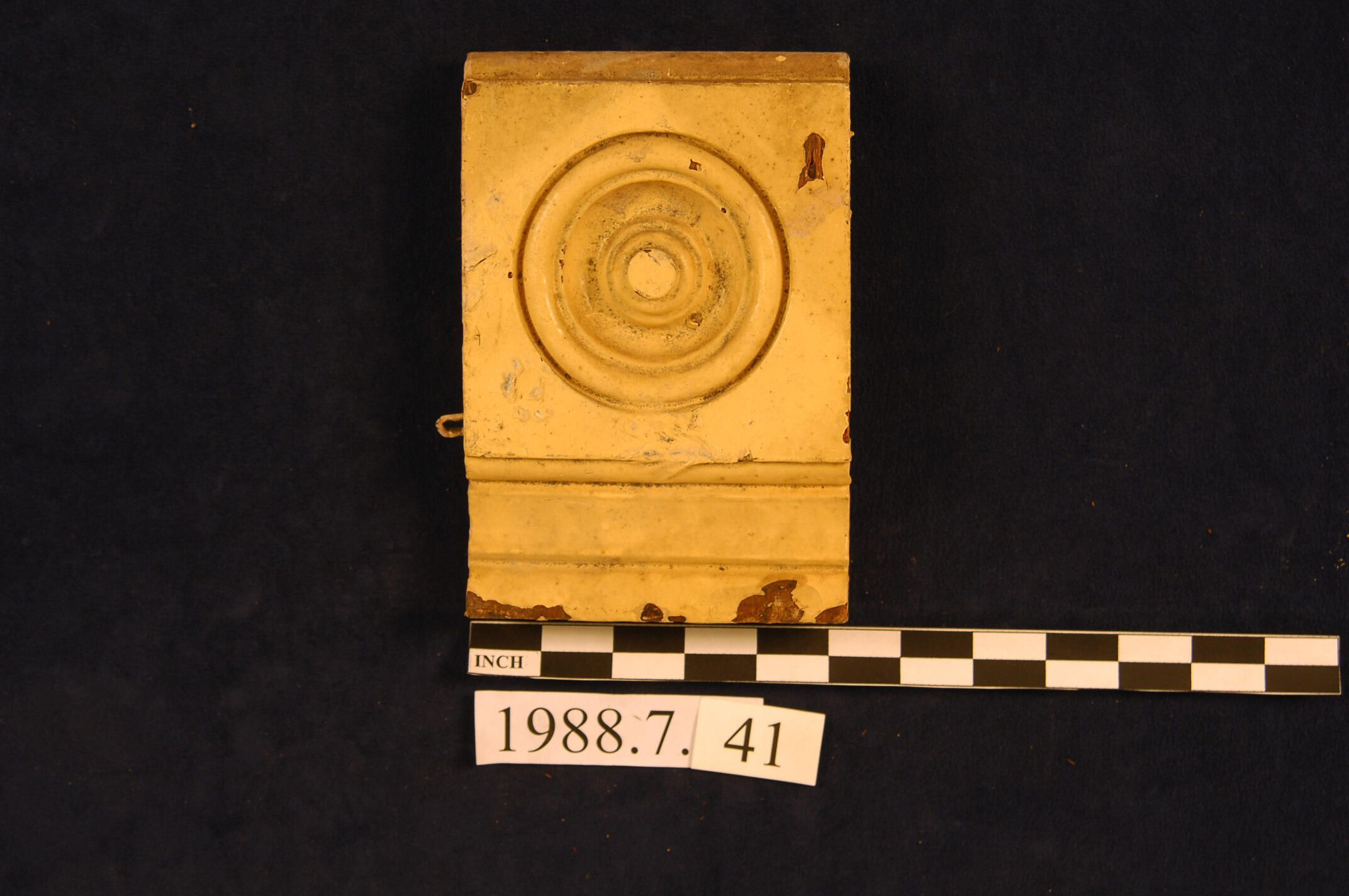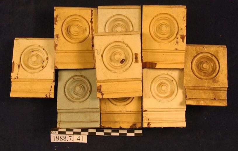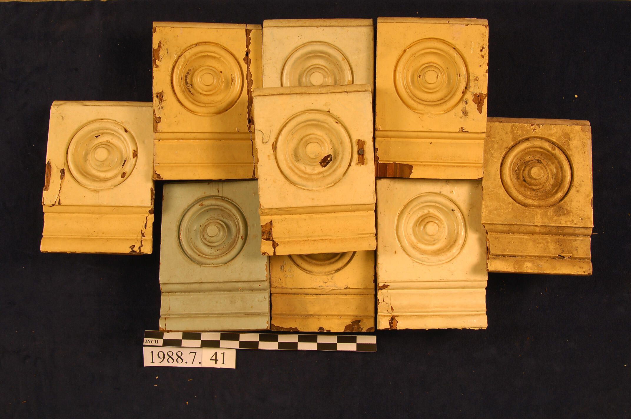 One lot of nine rectangular corner blocks. Molded top and bottom edges. Bulls eye center. Cedar. Square nails. Painted. One is split. Two with missing edge. One is missing corner.