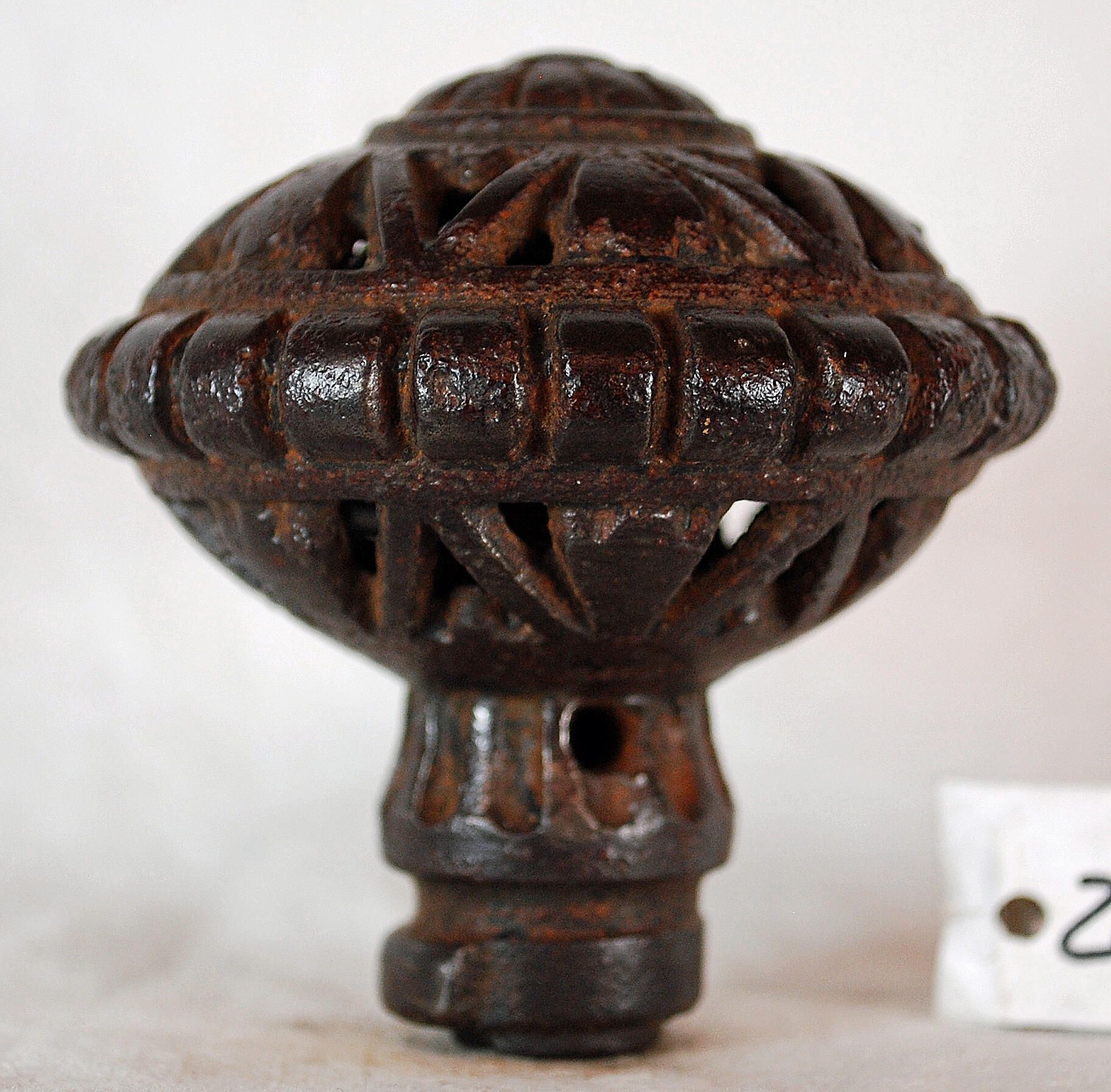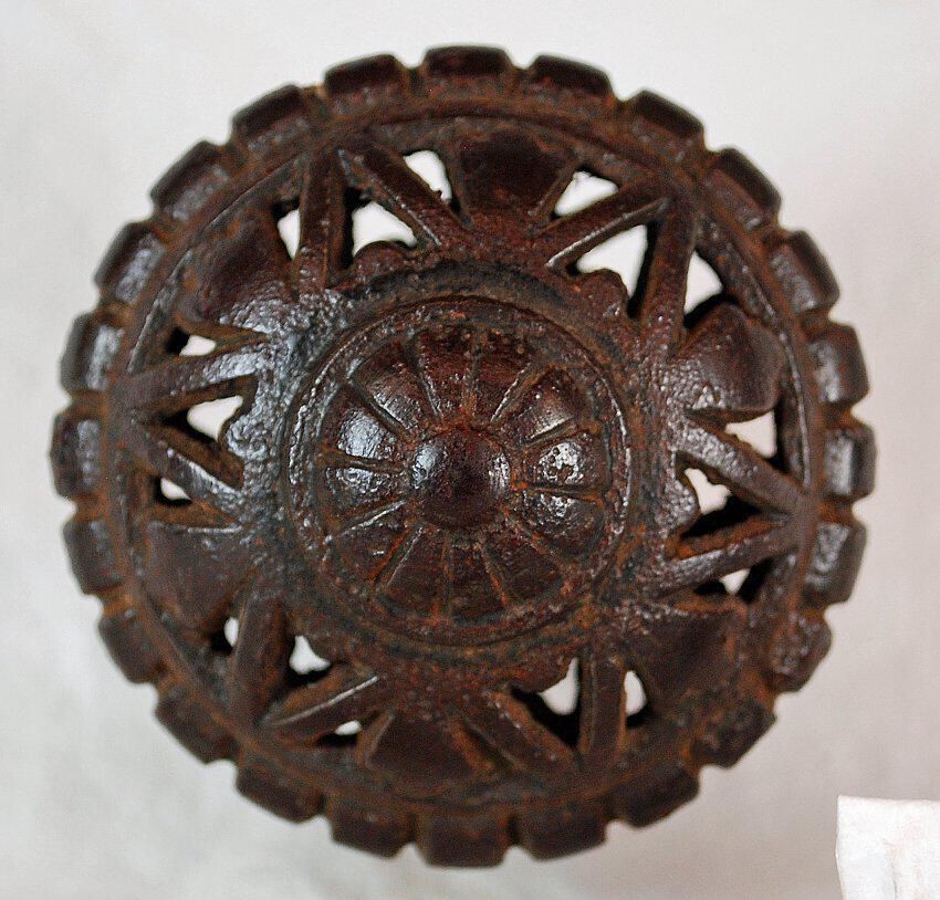 Design Name: Manufacture: Style: Material: Iron Manufacturing Method: Cast Surface Finish: Unpolished VDA Classification: Sixfold Symmetry VDA Number: I Shape: Domed Patent Specifics: Lock Type (If Applicable): Inscription/Makers Mark: Inscription Text: "Patent" Comments: Reticulated Hollow. One Piece Cast. Front Nub on Shank..
