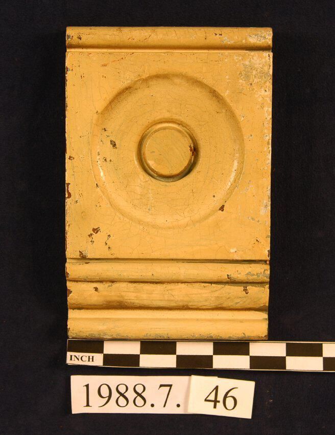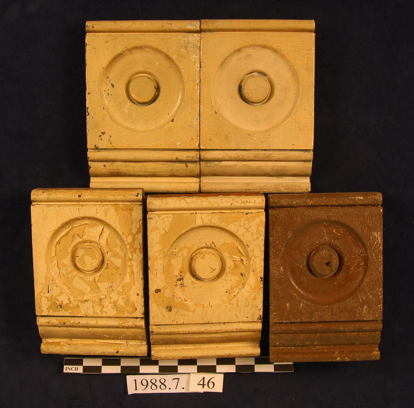 One lot of five rectangular corner blocks. Molded on top edge. Beaded on lower edge. Bulls eye center. Cedar. Painted. Inscriptions or Markings: Manufacturer: Place of Manufacturer: Design motif: Style: Finish: Painted.