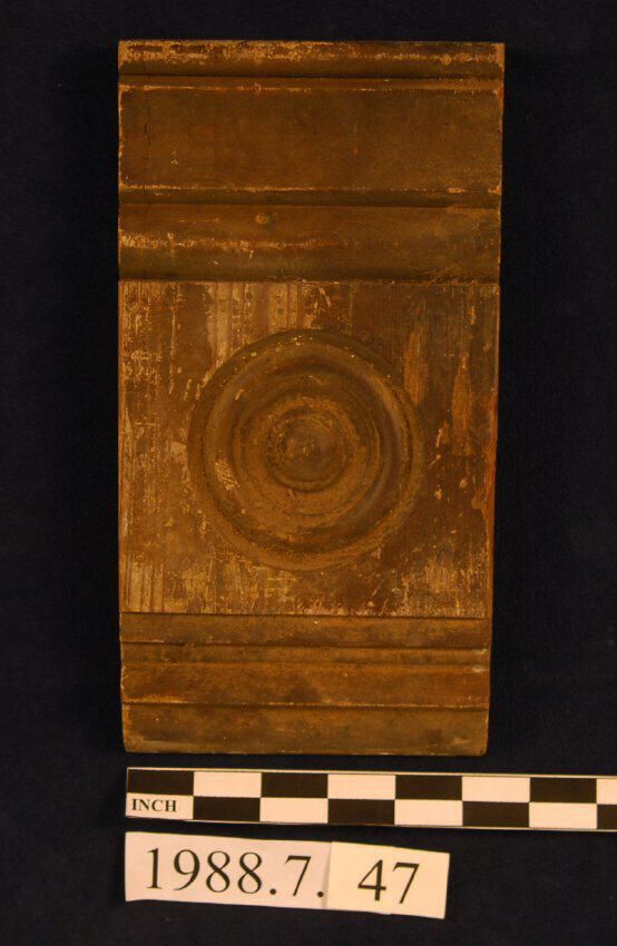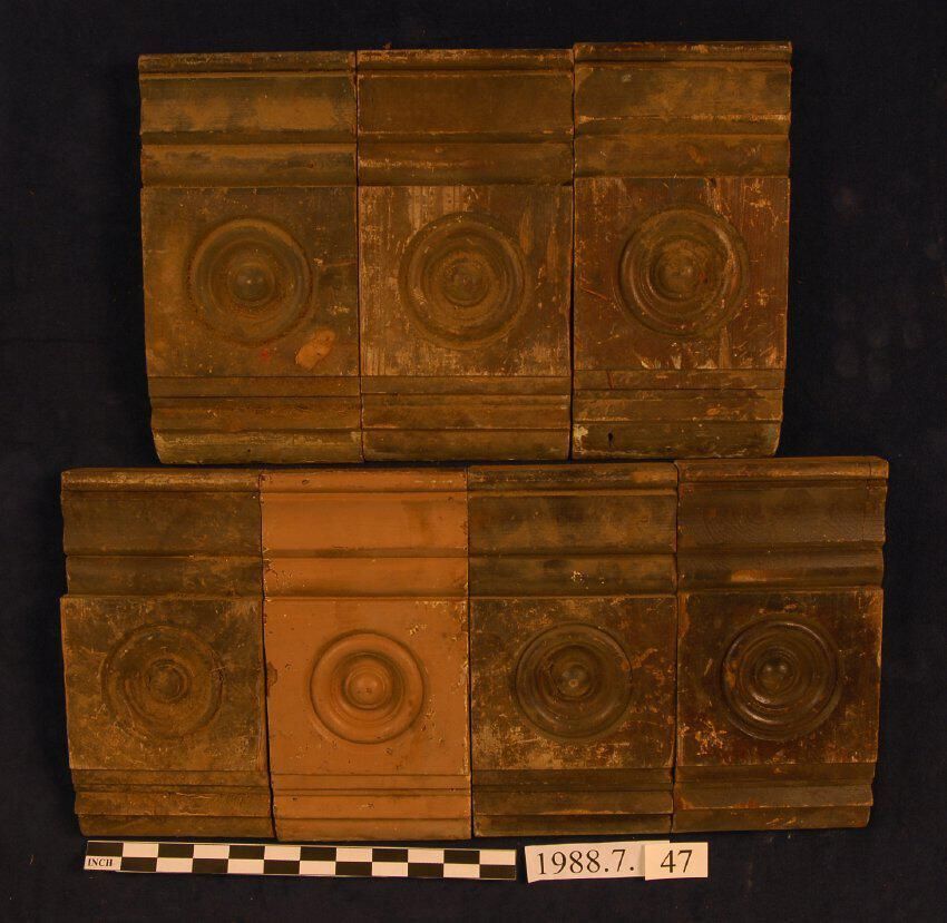 One lot of seven rectangular corner blocks. Molded on top and bottom edges.. Bulls eye center. Cedar. Six are varnished. One is painted. Inscriptions or Markings: Manufacturer: Place of Manufacturer: Design motif: Style: Finish: Varnished / Painted.
