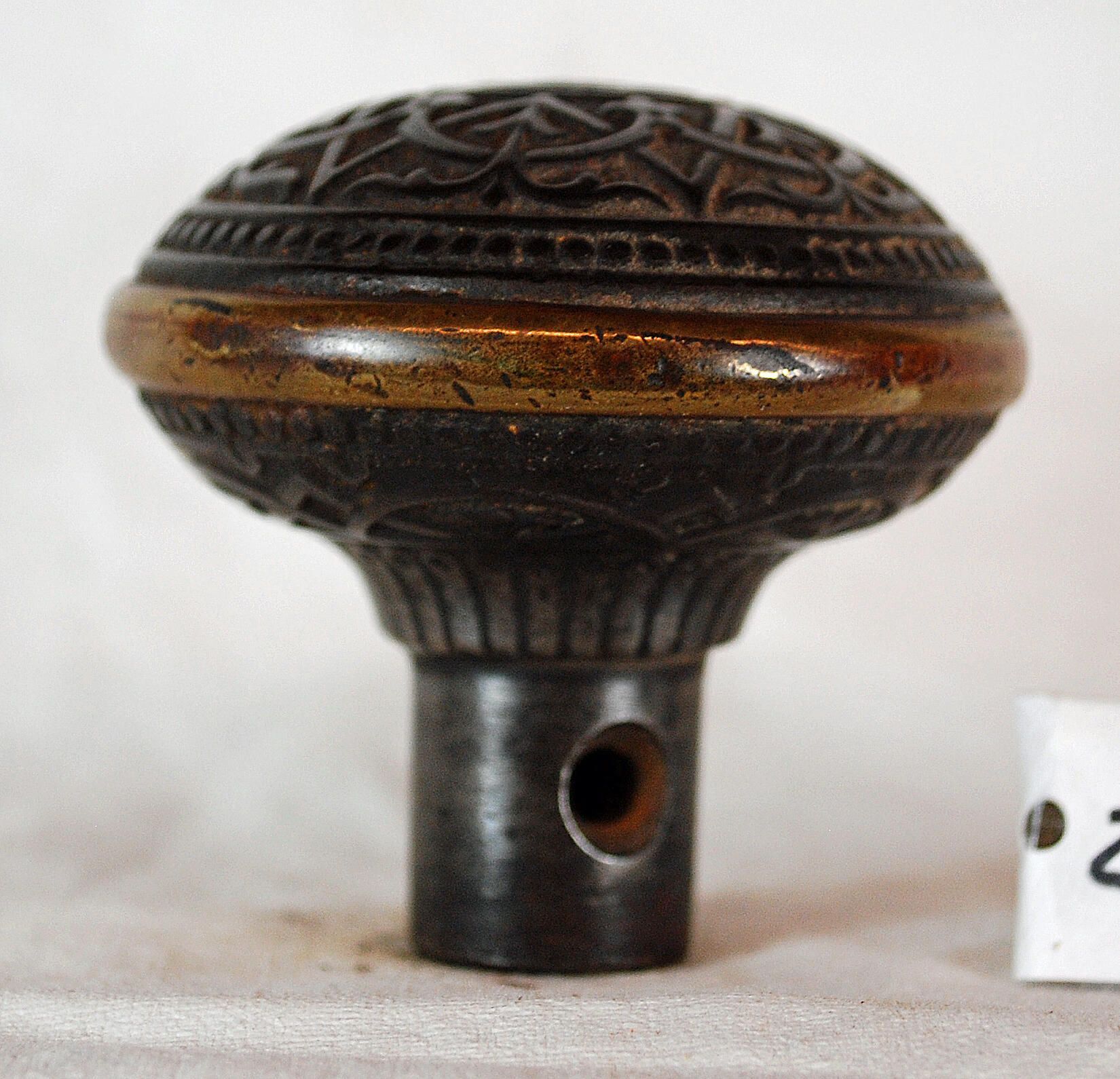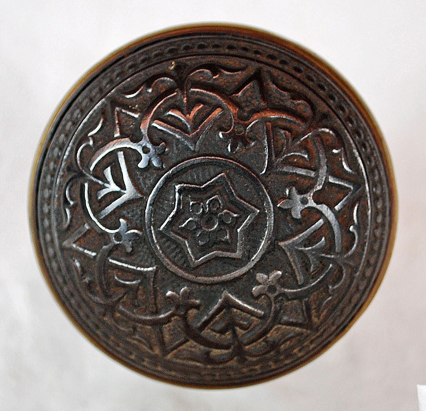 Design Name: Vernacular Manufacture: Trenton Style: Neo-Grec Material: Cast Iron Manufacturing Method: Cast Surface Finish: Aged / Unpolished VDA Classification: Sixfold J VDA Number: J - 202 Shape: Domed Patent Specifics: Lock Type (If Applicable): Inscription/Makers Mark: Inscription Text: Comments: Bronze Band Around Middle of Knob. Design Pattern Continues on Under Side.