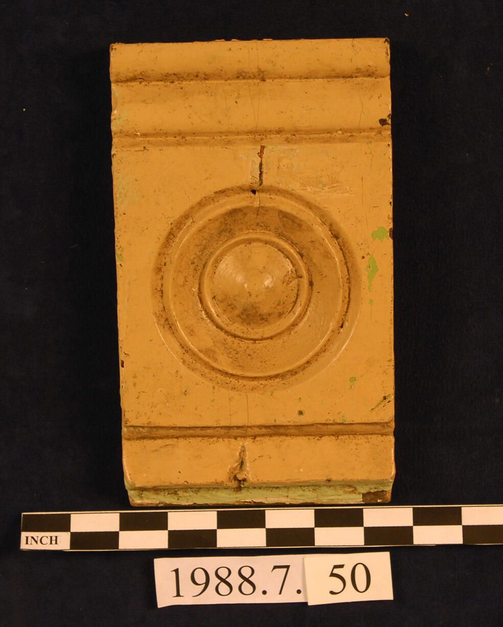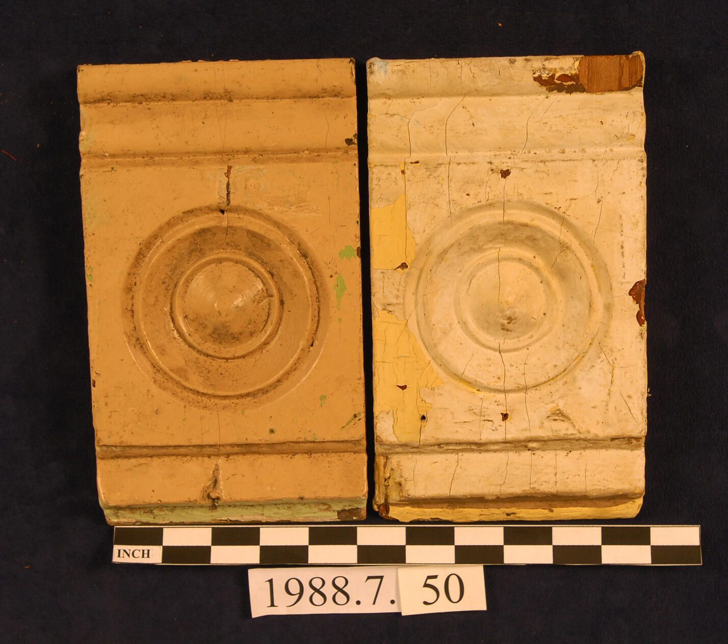 One lot of two rectangular corner blocks. Molded on top edge and front of lower edge. Bulls eye center. Cedar. Painted. Inscriptions or Markings: Manufacturer: Place of Manufacturer: Design motif: Style: Finish: Painted.