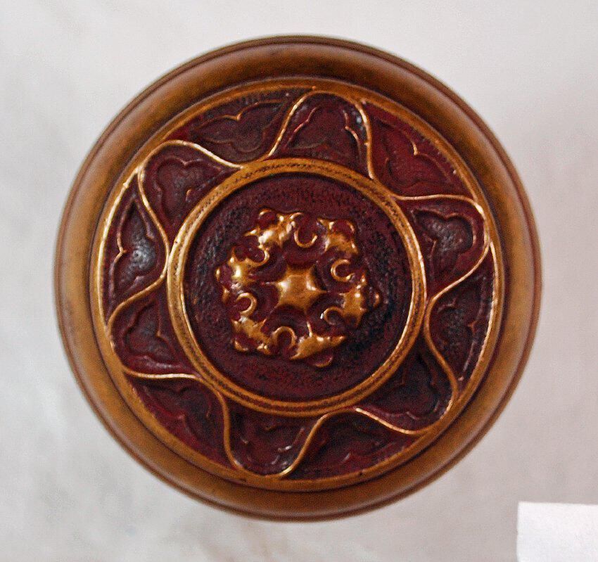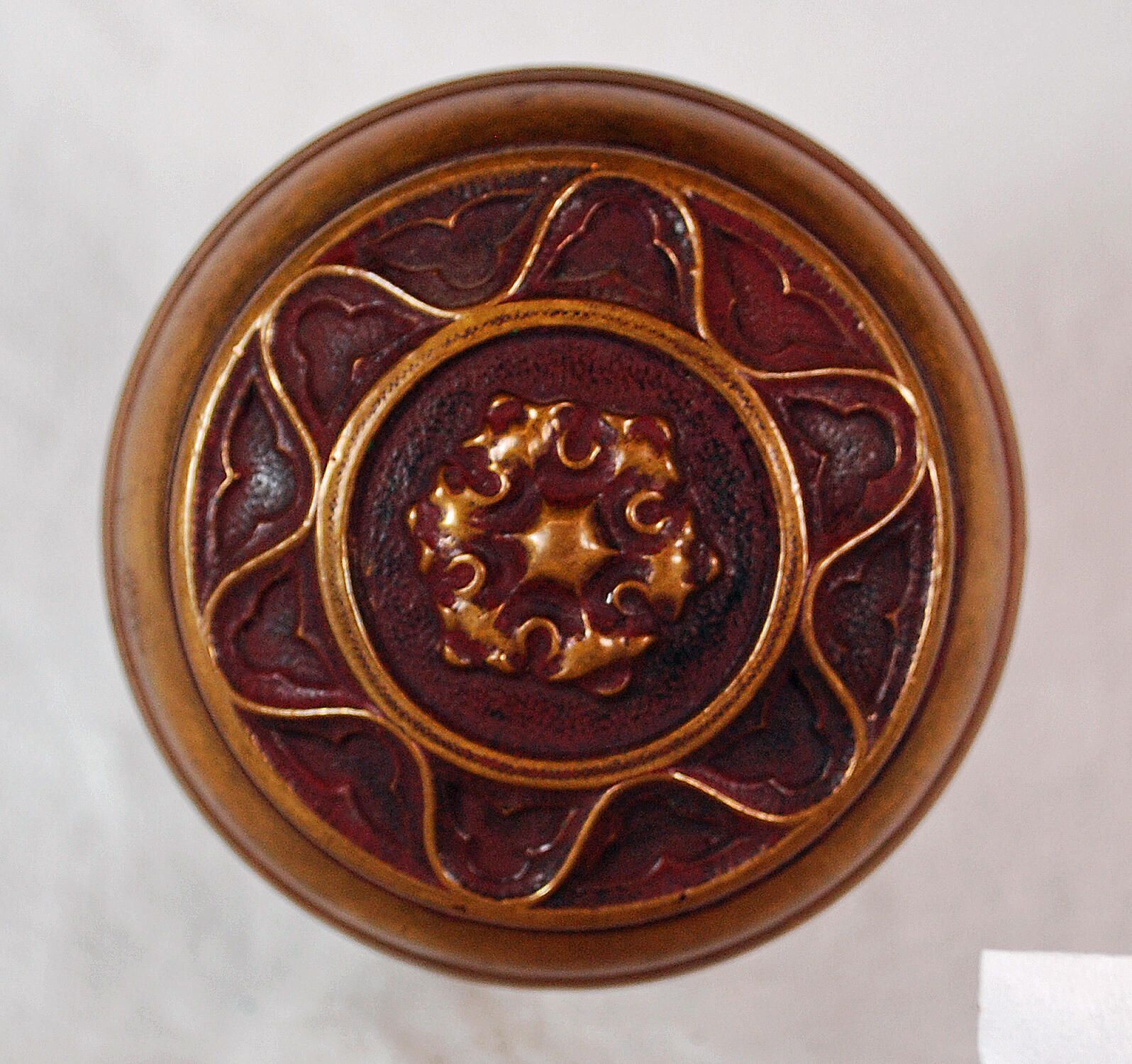 Design Name: Manufacture: Yale & Towne Mfg. Co. Style: Gothic Material: Bronze Manufacturing Method: Cast Surface Finish: Aged / Unpolished VDA Classification: Sixfold Symmetry VDA Number: Shape: Domed Patent Specifics: Lock Type (If Applicable): Inscription/Makers Mark: Inscription Text: Comments:
