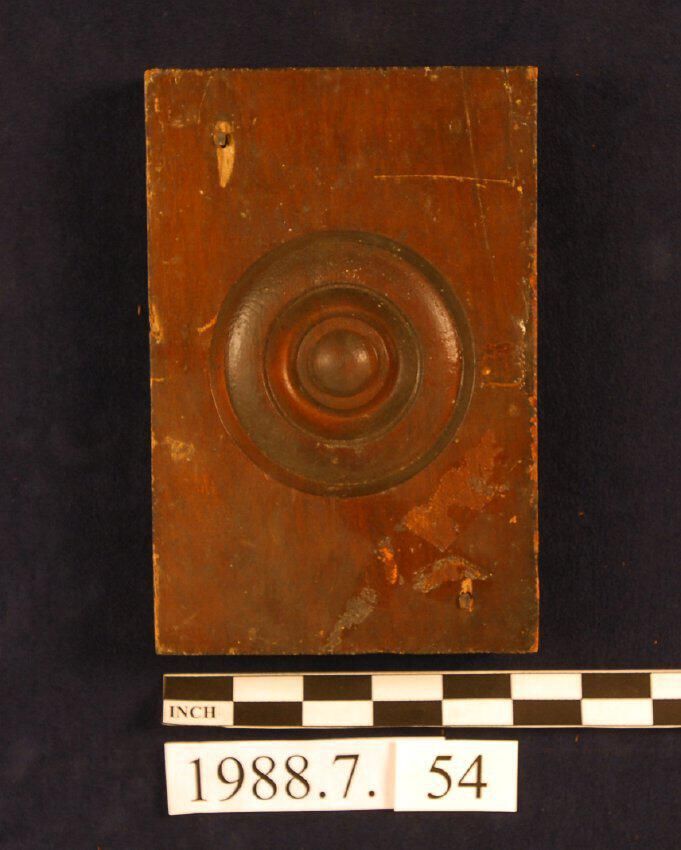 Rectangular corner block. Bulls eye center. Cedar. Varnished. Square nails. Inscriptions or Markings: Manufacturer: Place of Manufacturer: Design motif: Style: Finish: Varnished.