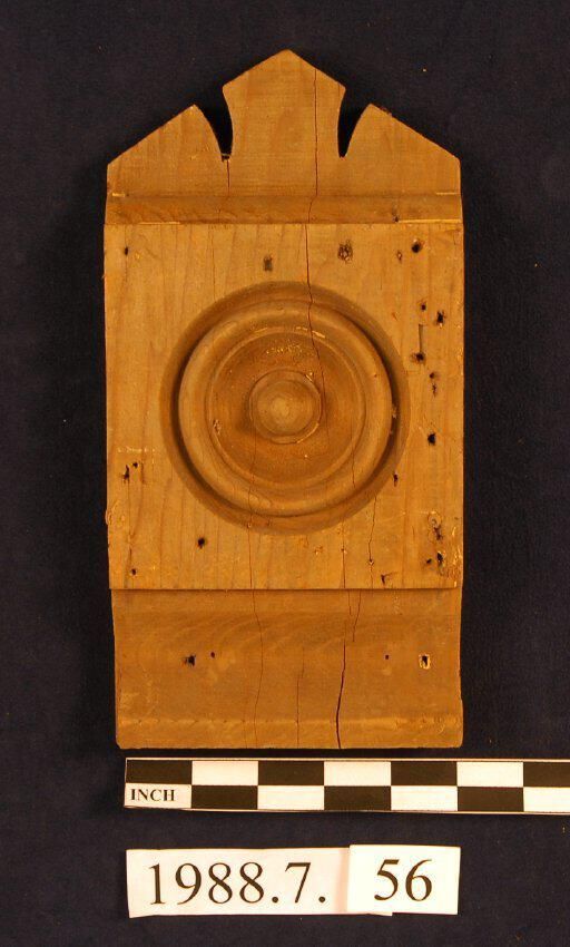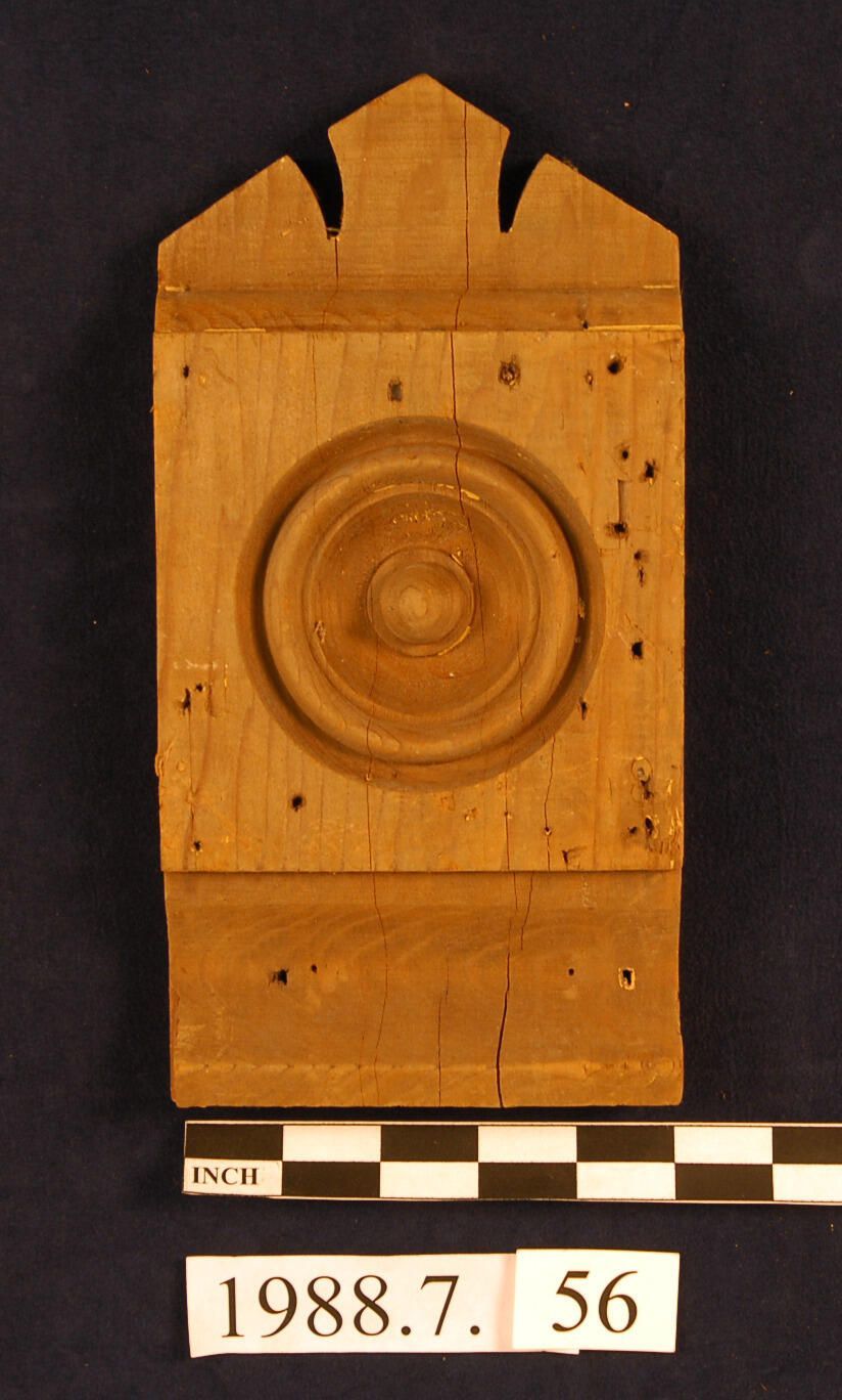 Rectangular corner block. Triangular top with two cut notches forming central finial. Lower front cove (concave). Molded. Bulls eye center. Remnants of paint.