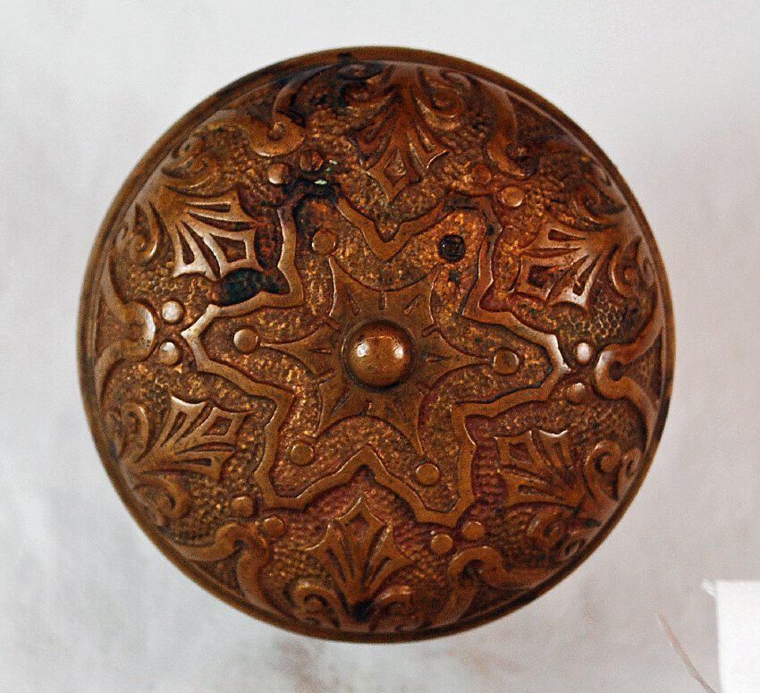 Design Name: Star Manufacture: Branford Lock Works Style: Neo-Grec Material: Bronze Manufacturing Method: Cast Surface Finish: Unpolished VDA Classification: Sixfold Symmetry VDA Number: J - 217 Shape: Domed Patent Specifics: Lock Type (If Applicable): Inscription/Makers Mark: Inscription Text: Comments: Raised Direct Center-Detail . Different Than VDA Book Example.